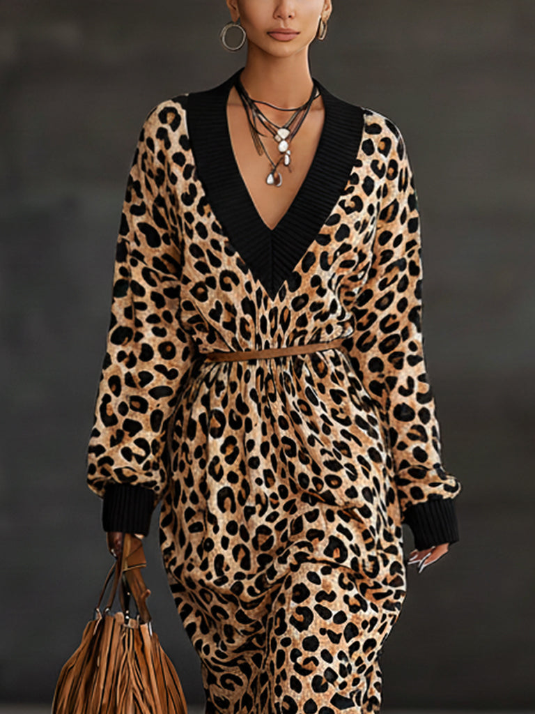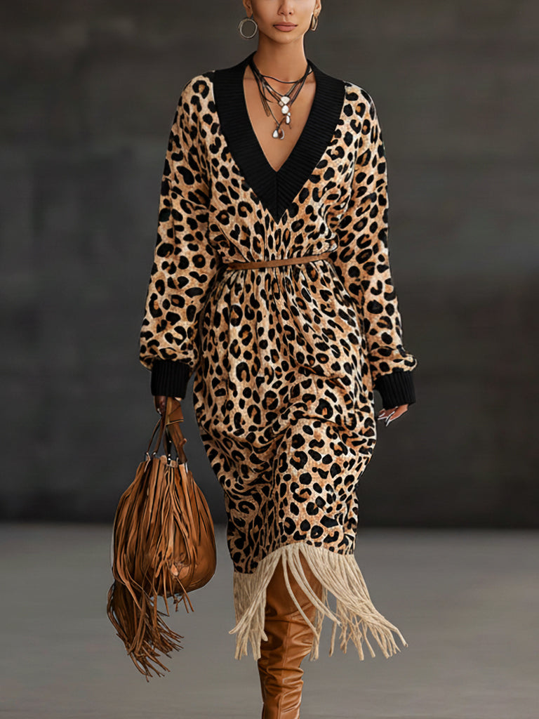 Brown Leopard Print Knit V-Neck Fringe Midi Dress