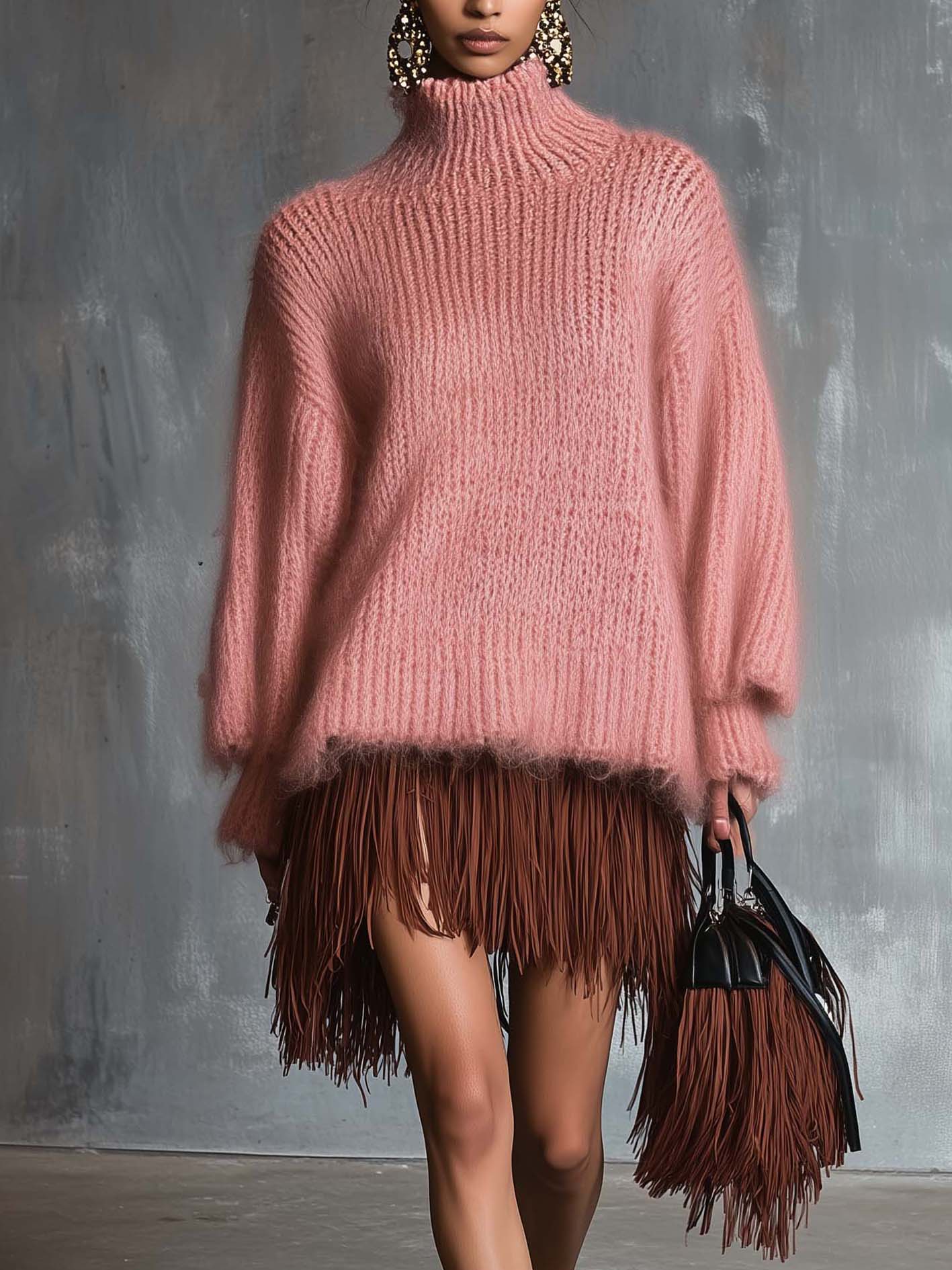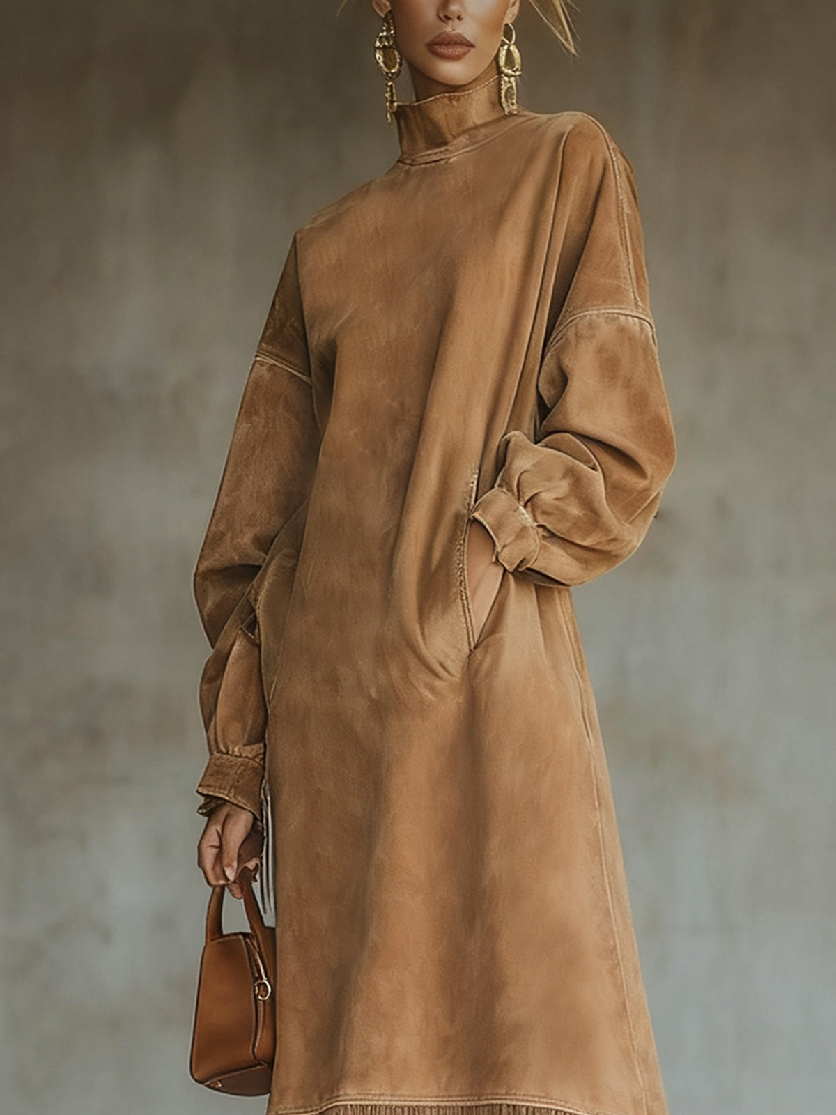 Khaki Square Suede Turtleneck Long Dress With Fringed Hem