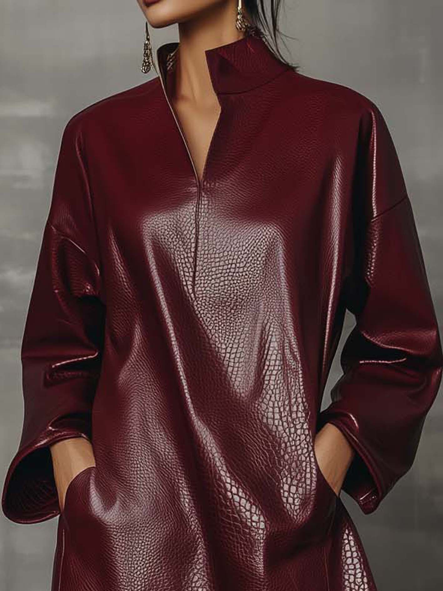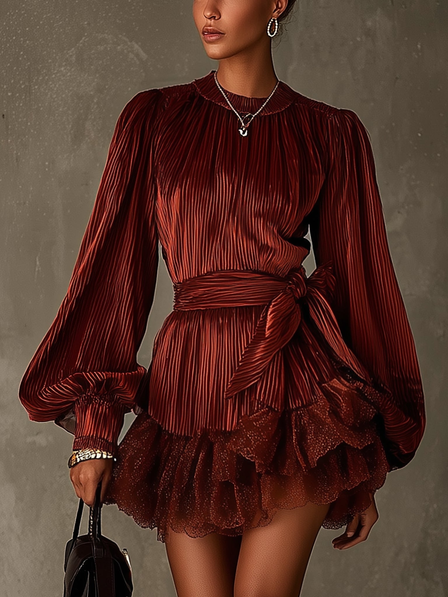 Burgundy Velvet Ruffle Chiffon Long Sleeve Midi Dress