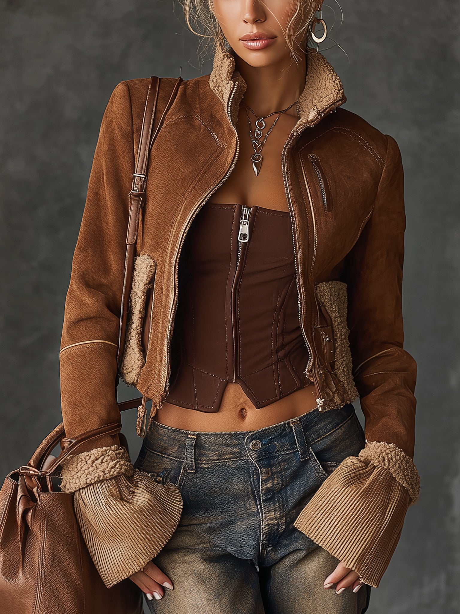 Vintage Brown Faux Suede Long Sleeve Jacket With Sherpa Trim