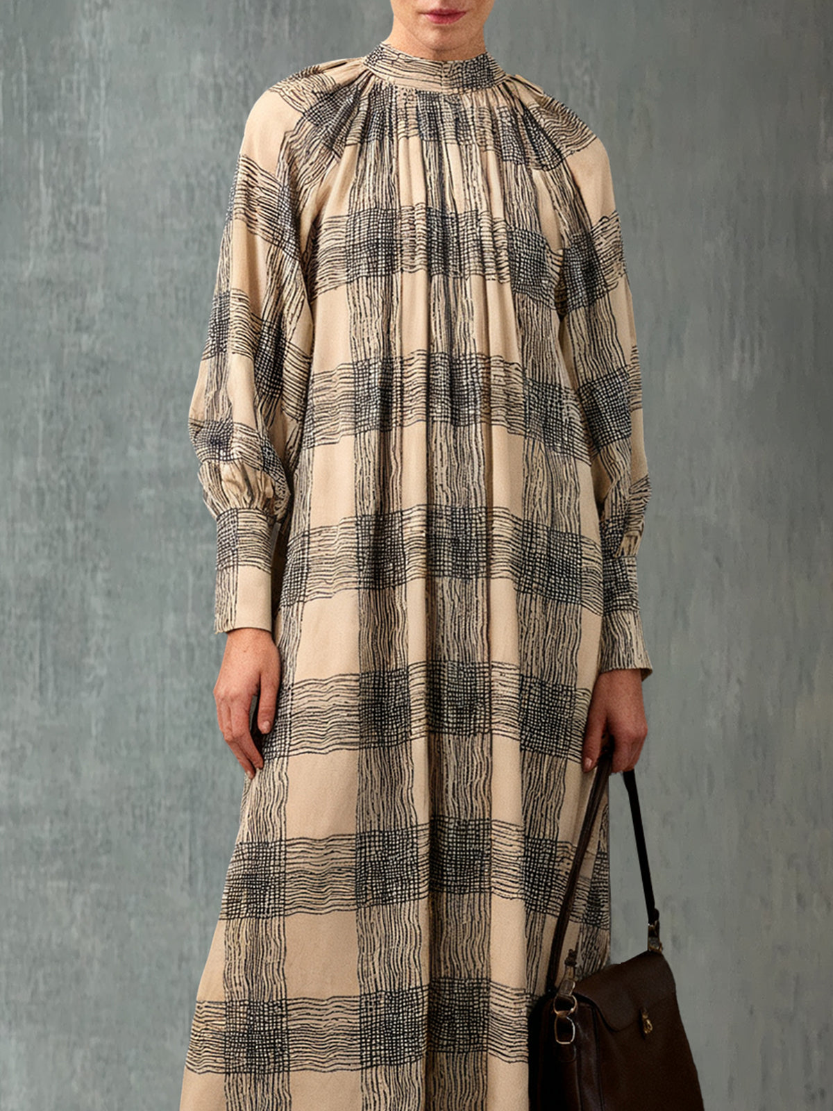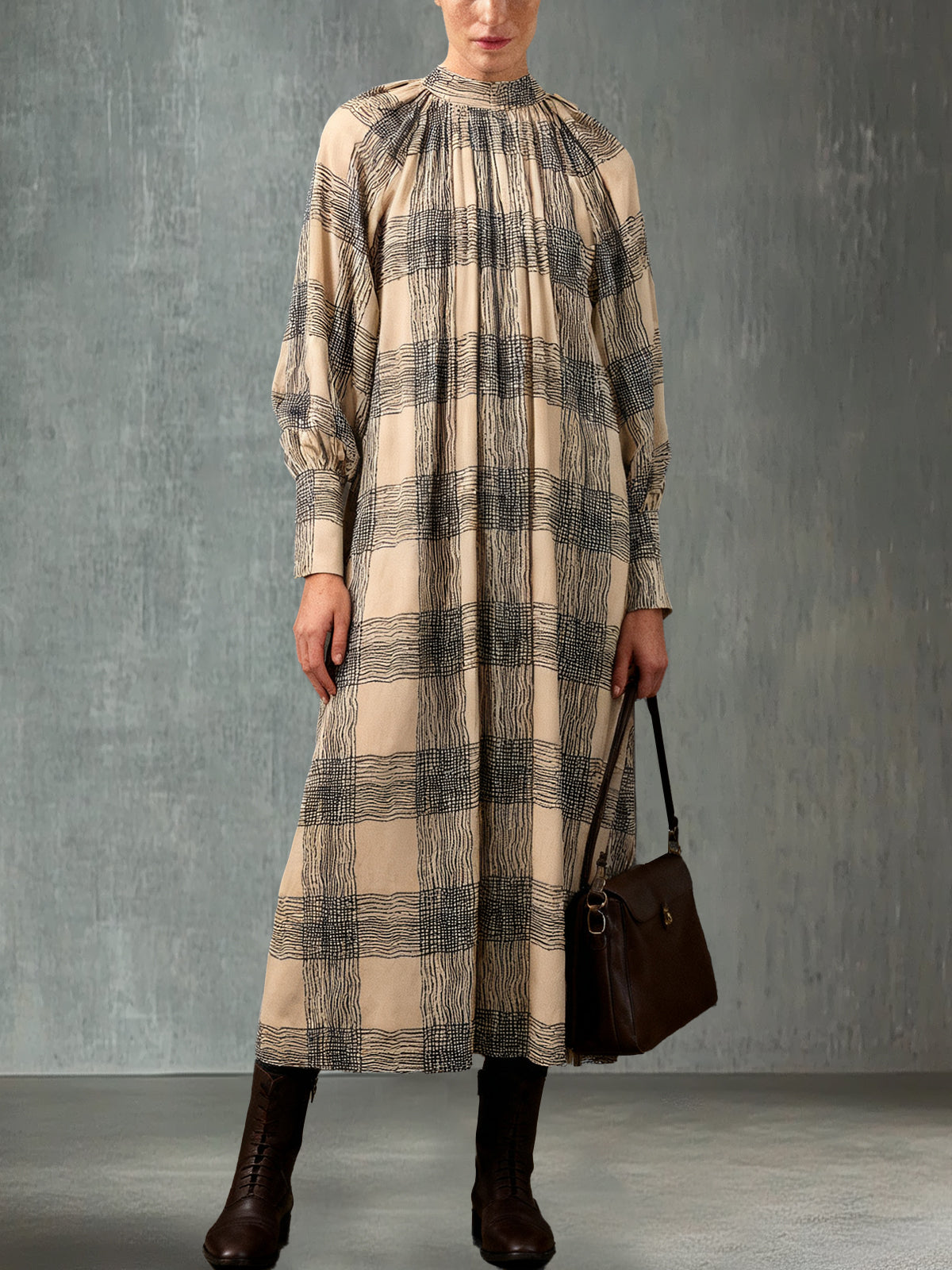 Beige Plaid Long-Sleeve Maxi Dress With High Neck