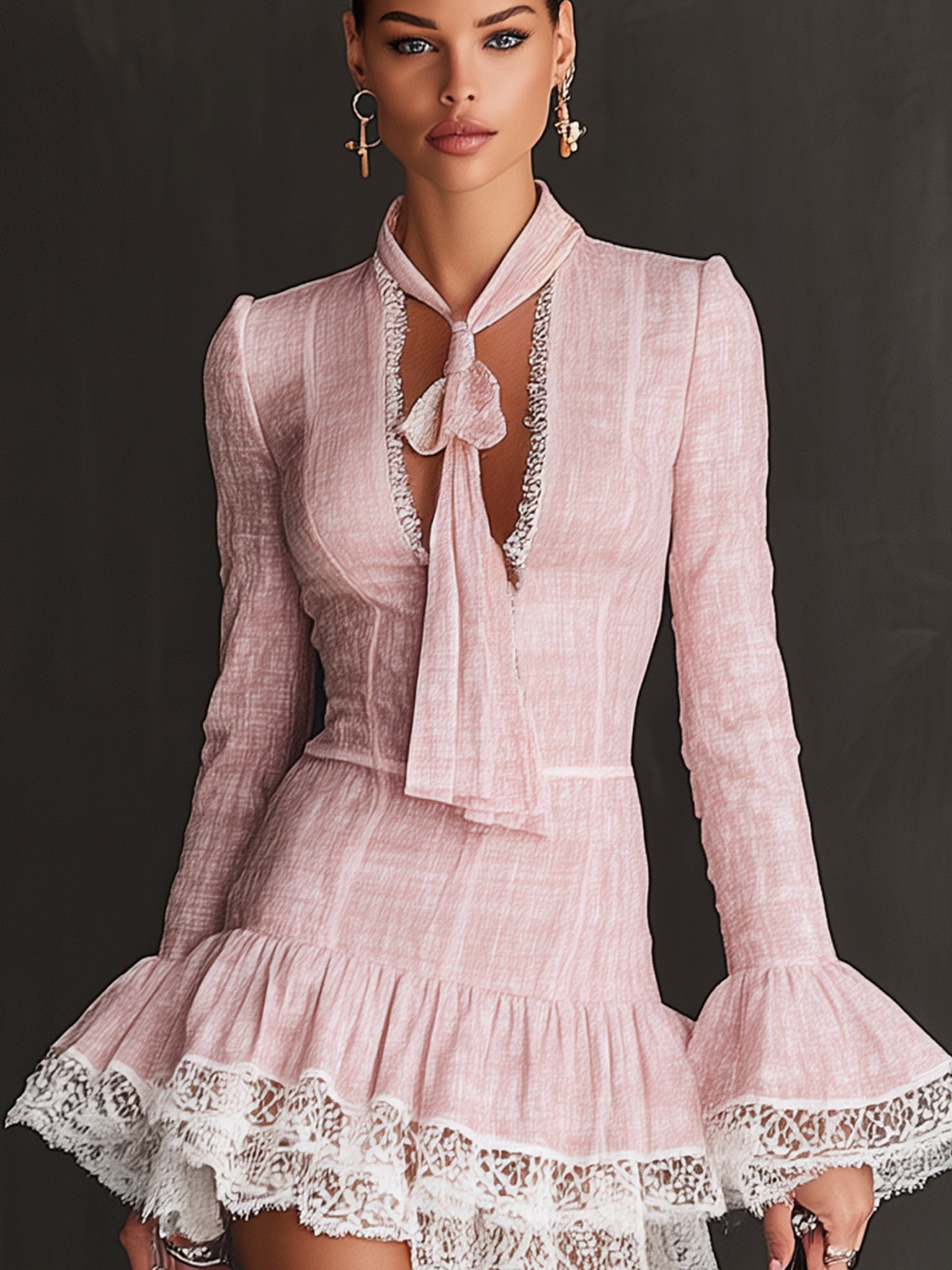Blush Tweed Lace Trimmed Long Sleeve Mini Dress