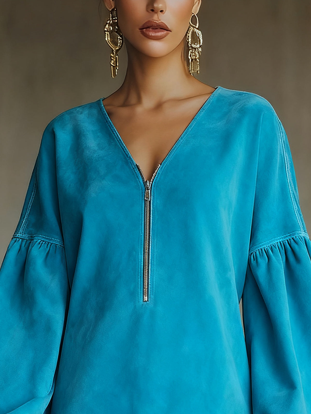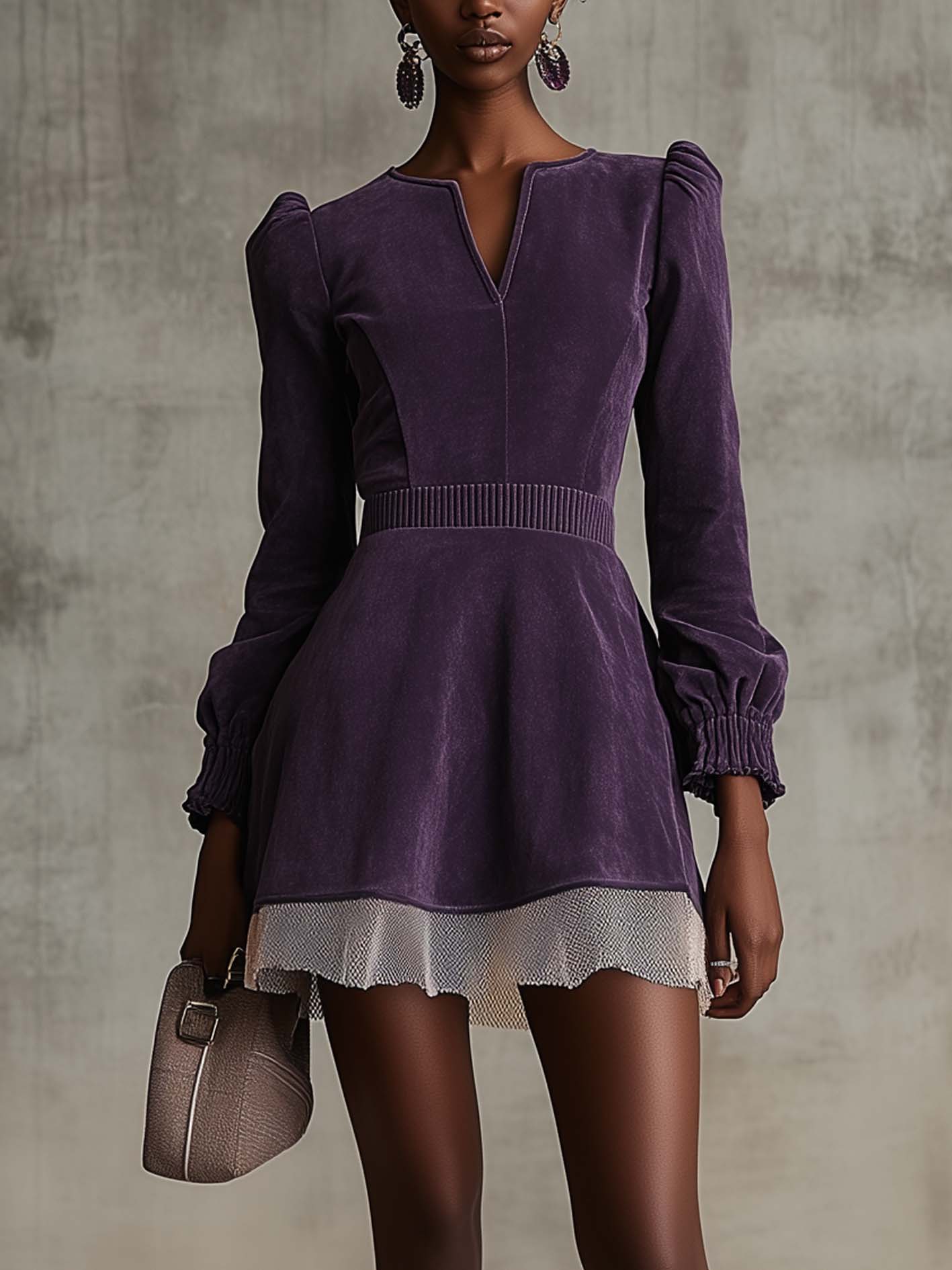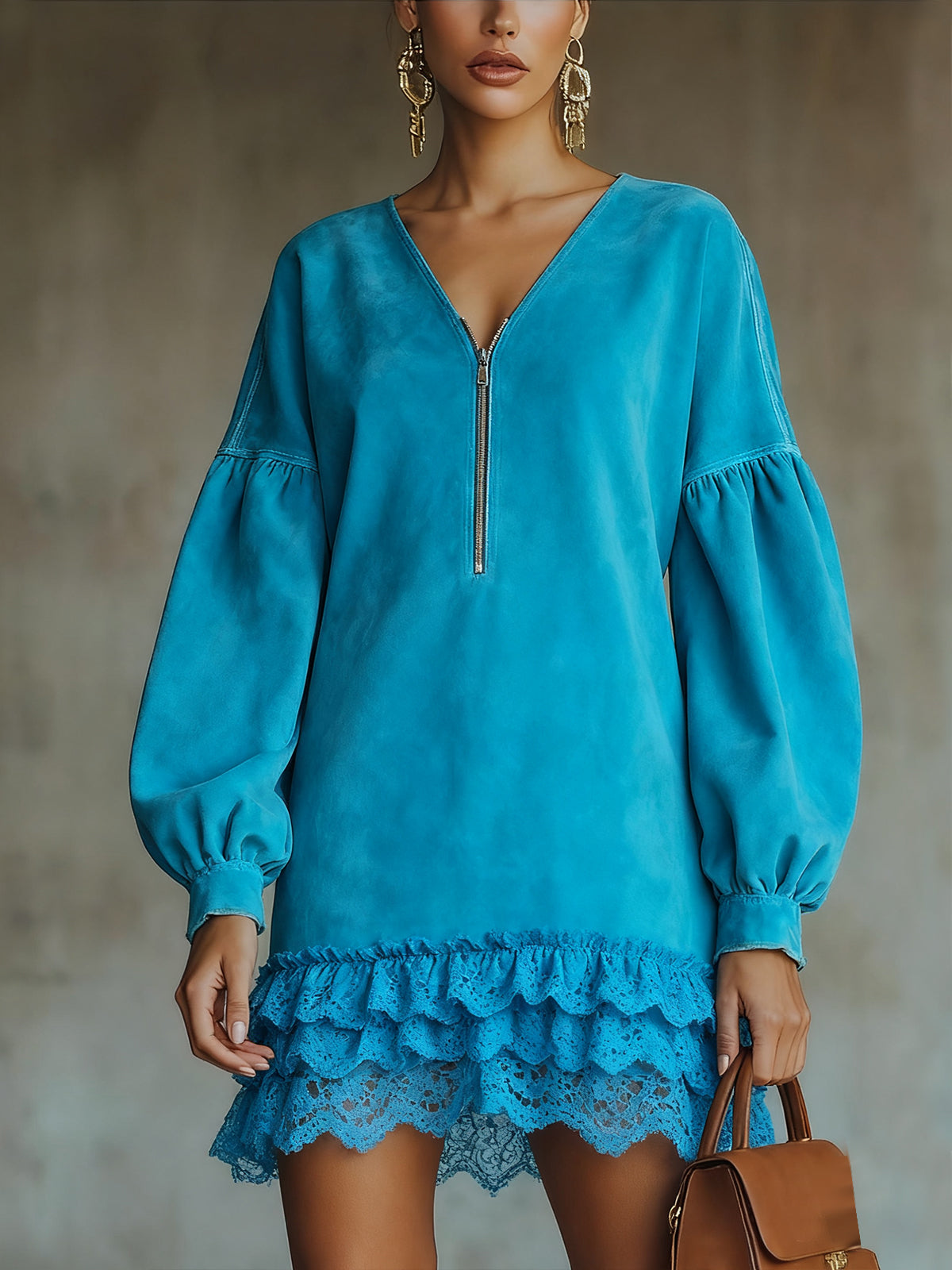 Sky Blue Faux Suede V-Neck Mini Dress With Lace Hem