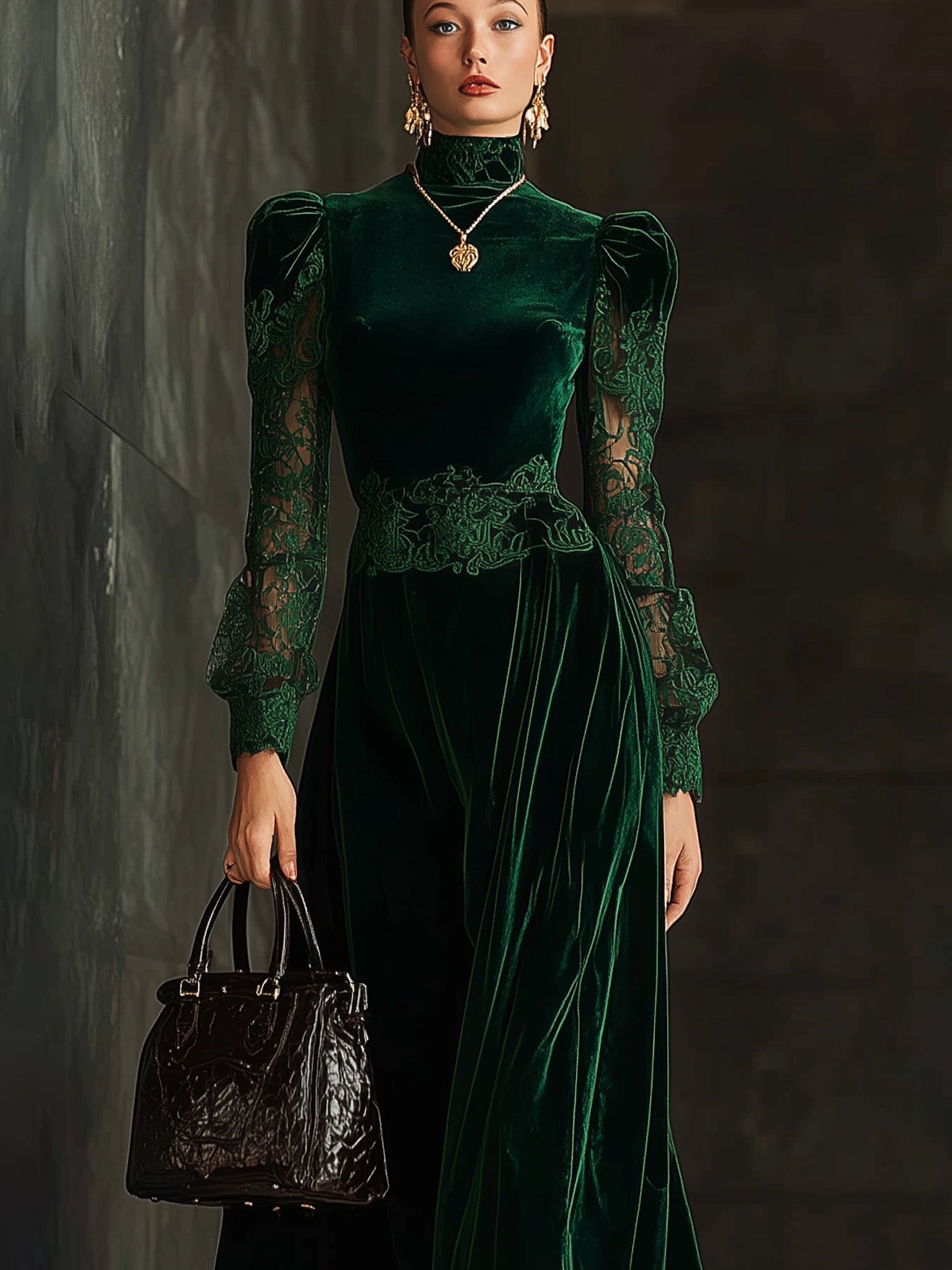 Emerald Velvet Lace Trim High Neck Long Sleeve Maxi Dress