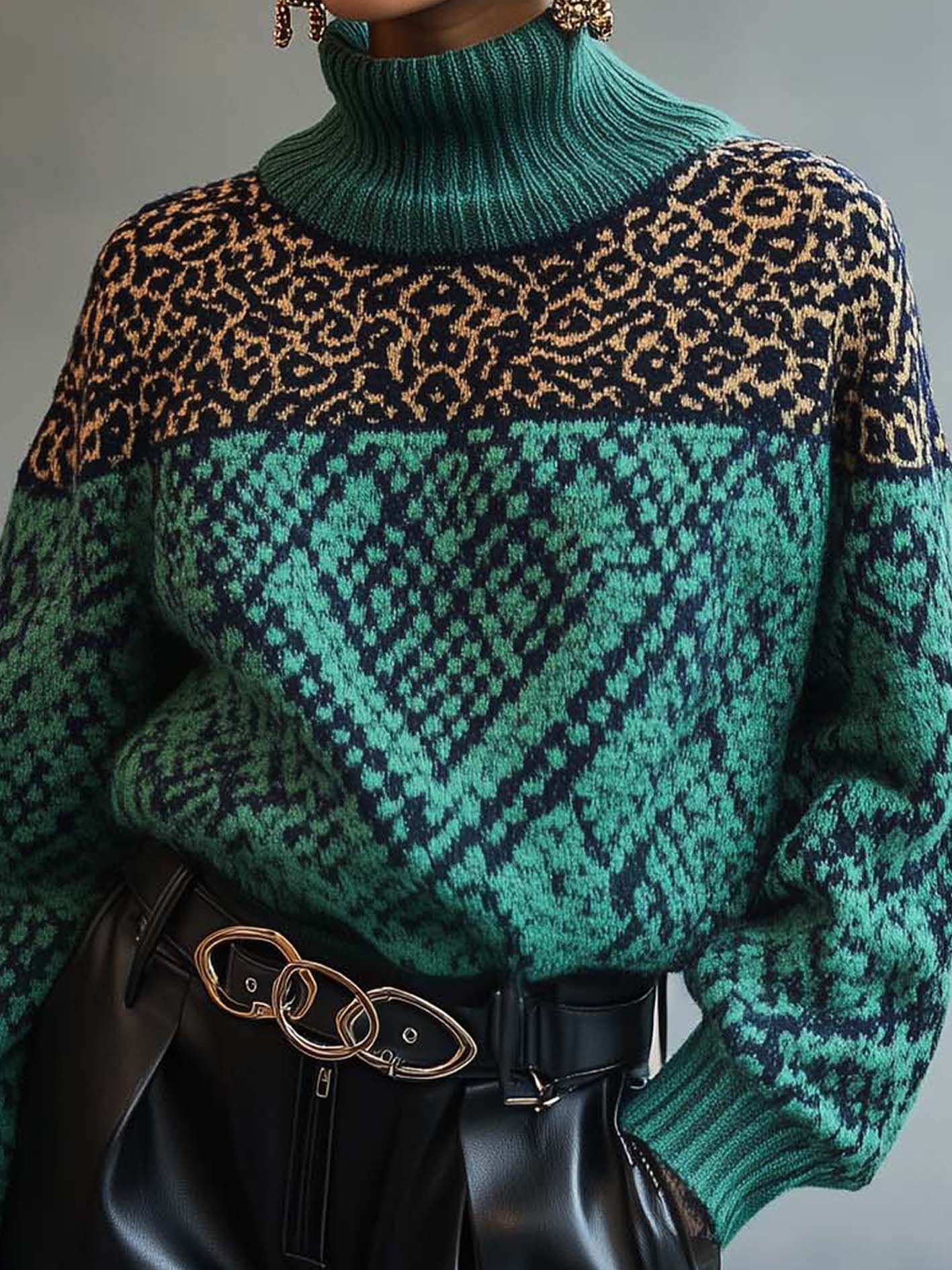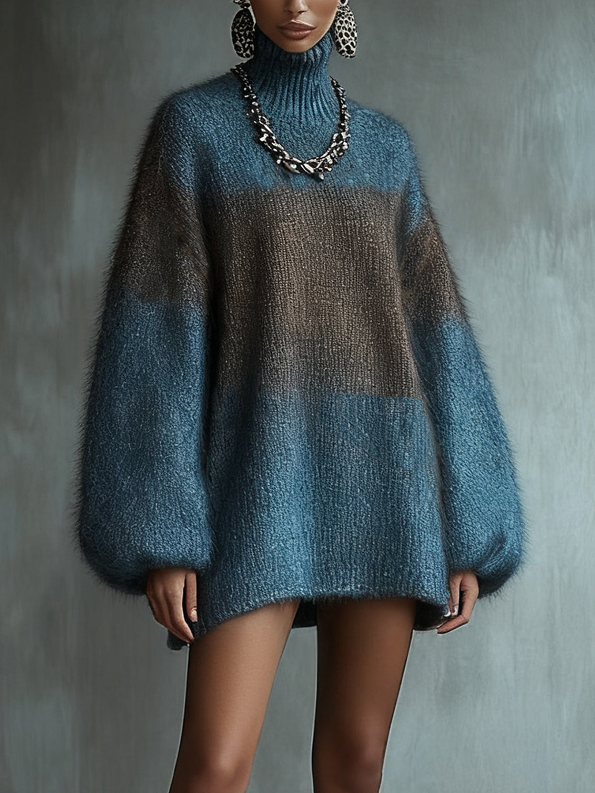 Blue Ombre Knit Turtleneck Dress With Balloon Sleeves