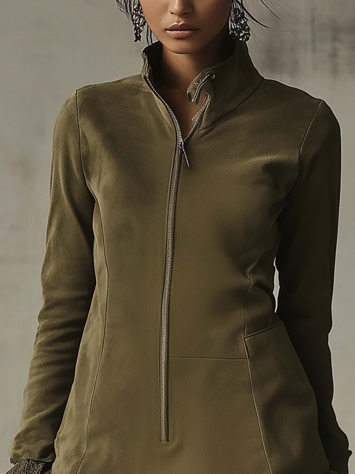 Olive Green Faux Suede Mini Dress With Zipper And Lace