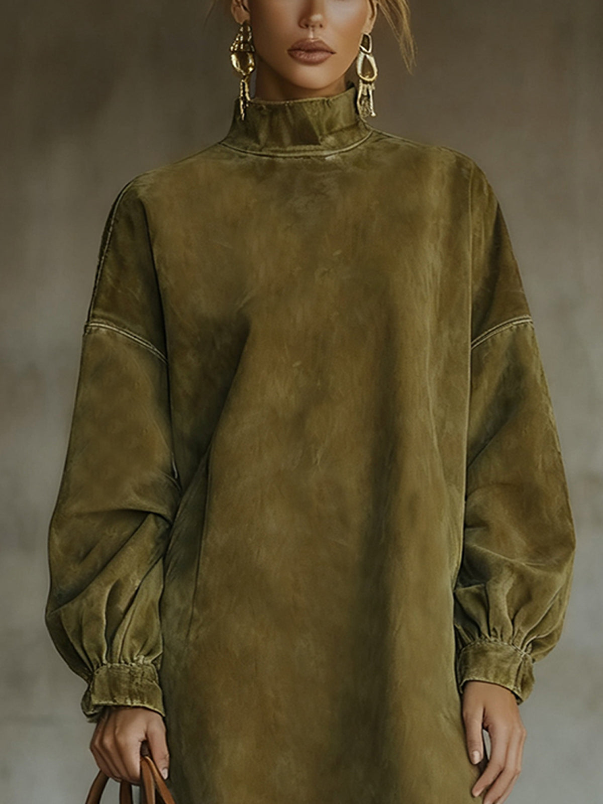 Army Green High Neck Square Suede Maxi Dress With Lace Hem