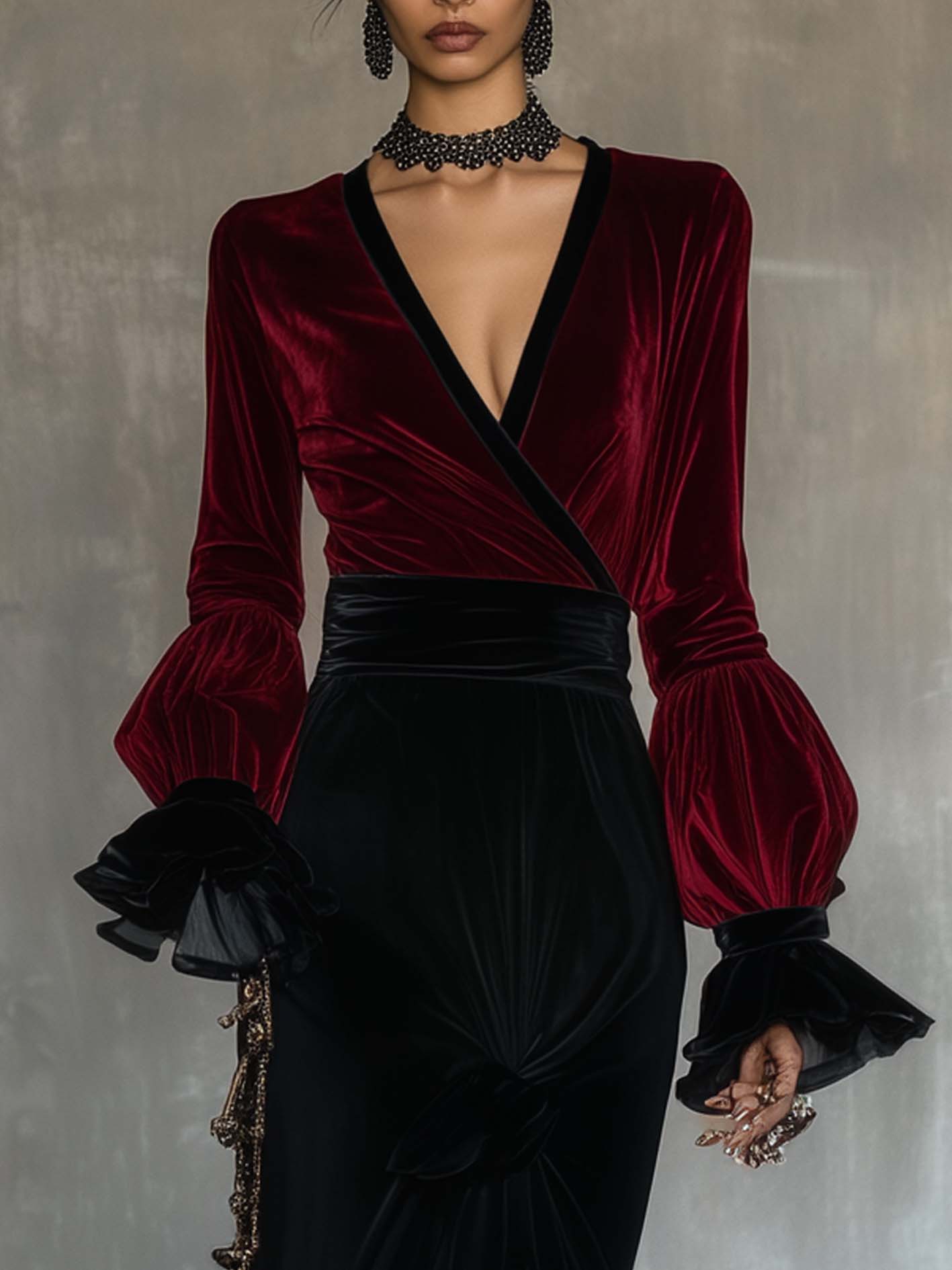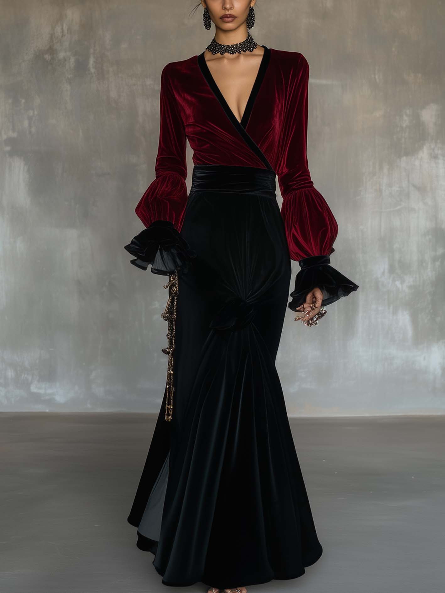 Black V-neck Velvet Maxi Dress With Red And Lace