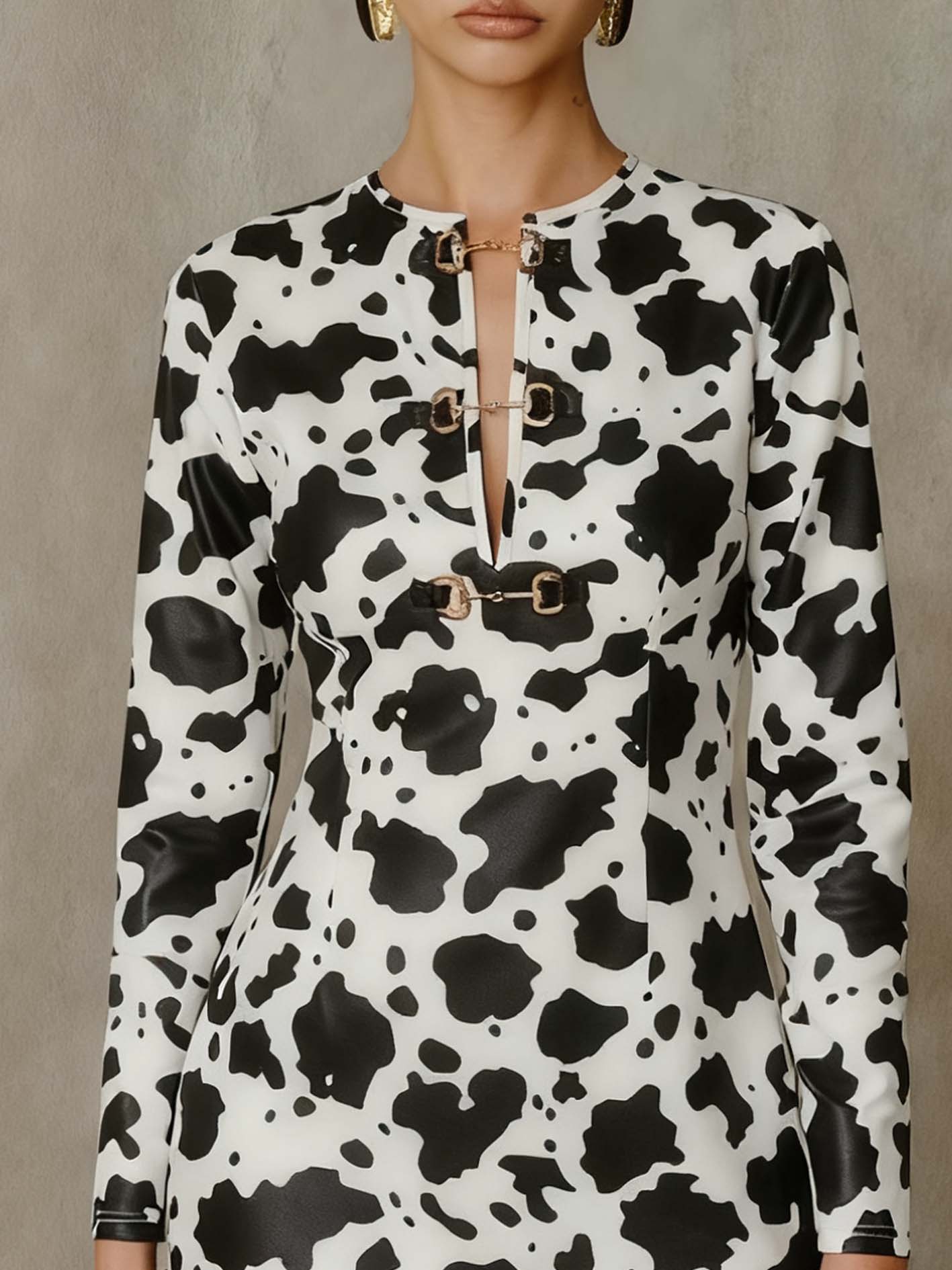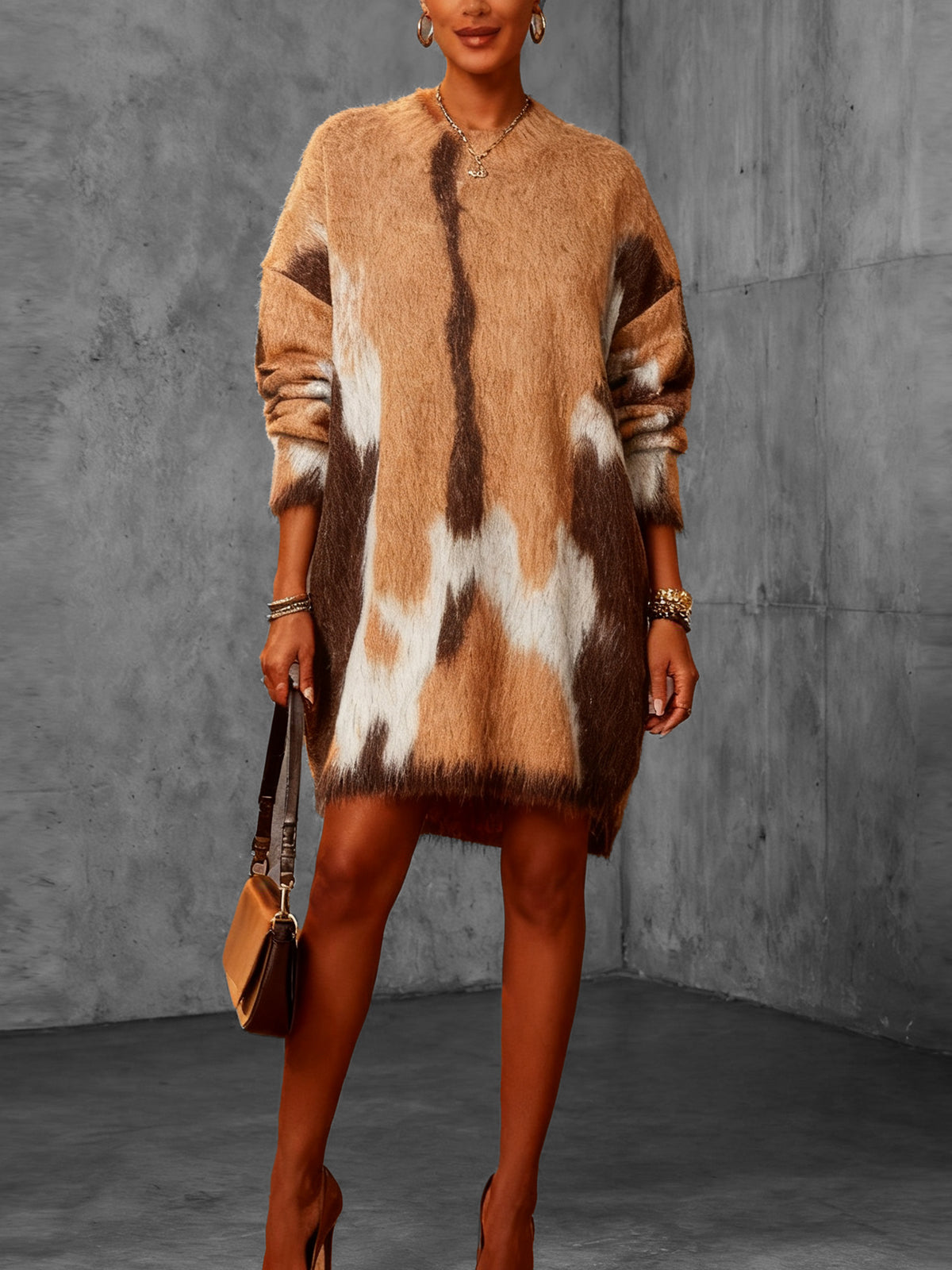 Brown Fuzzy Animal Print Knit Sweater Dress