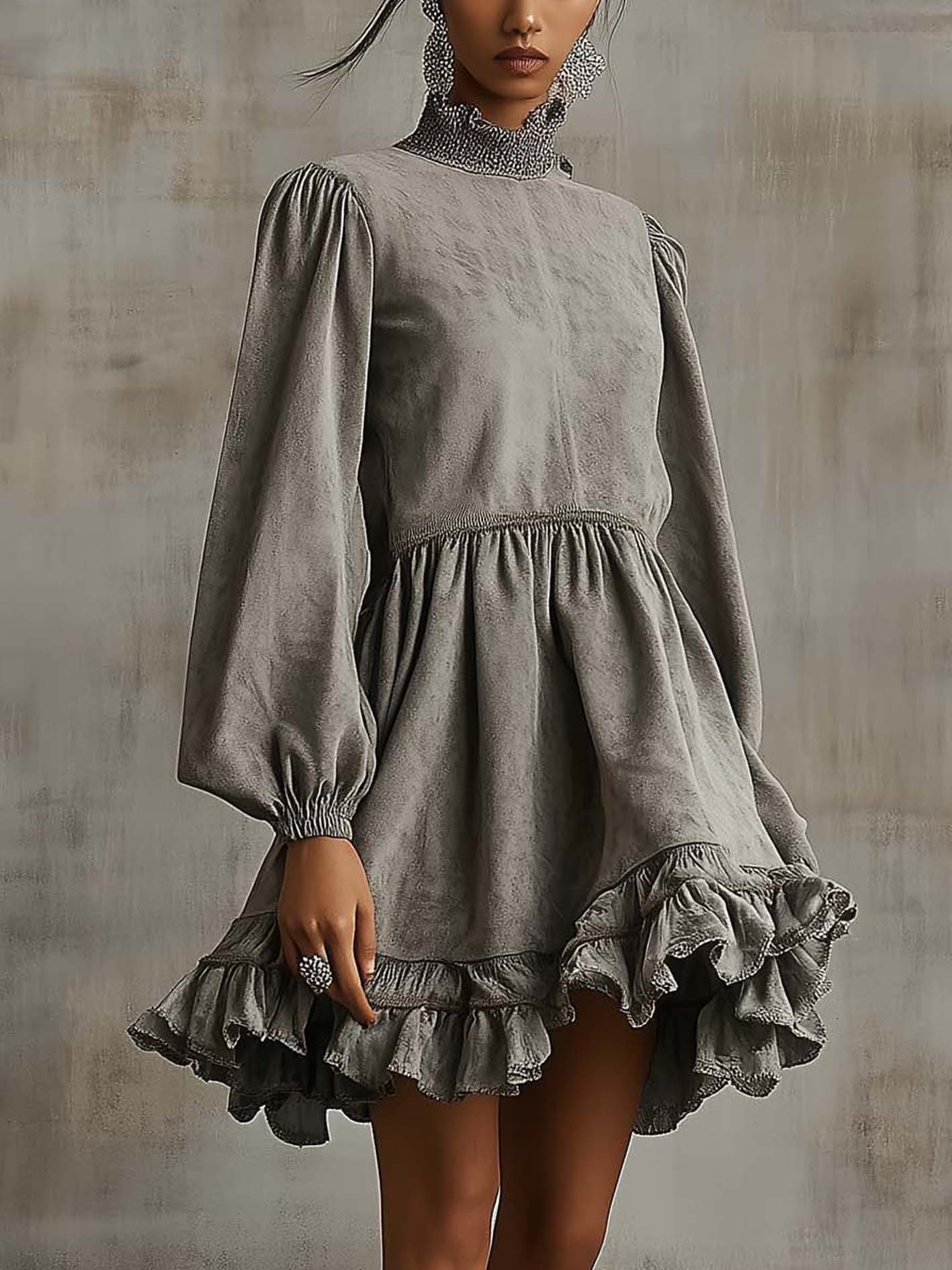Gray Faux Suede Mini Dress With Ruffled Panels