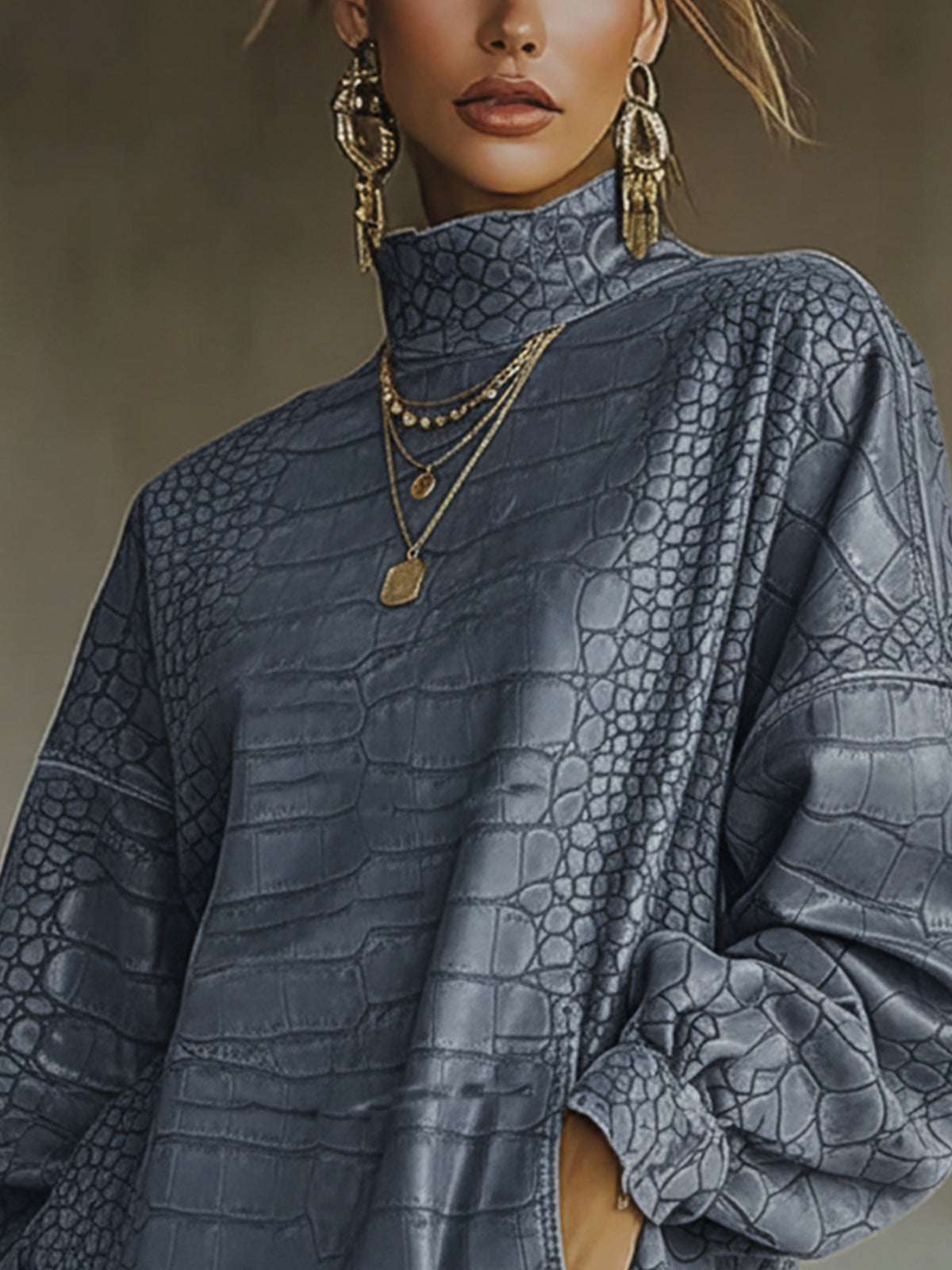 Blue Crocodile-Textured Fringed High Collar Mini Dress