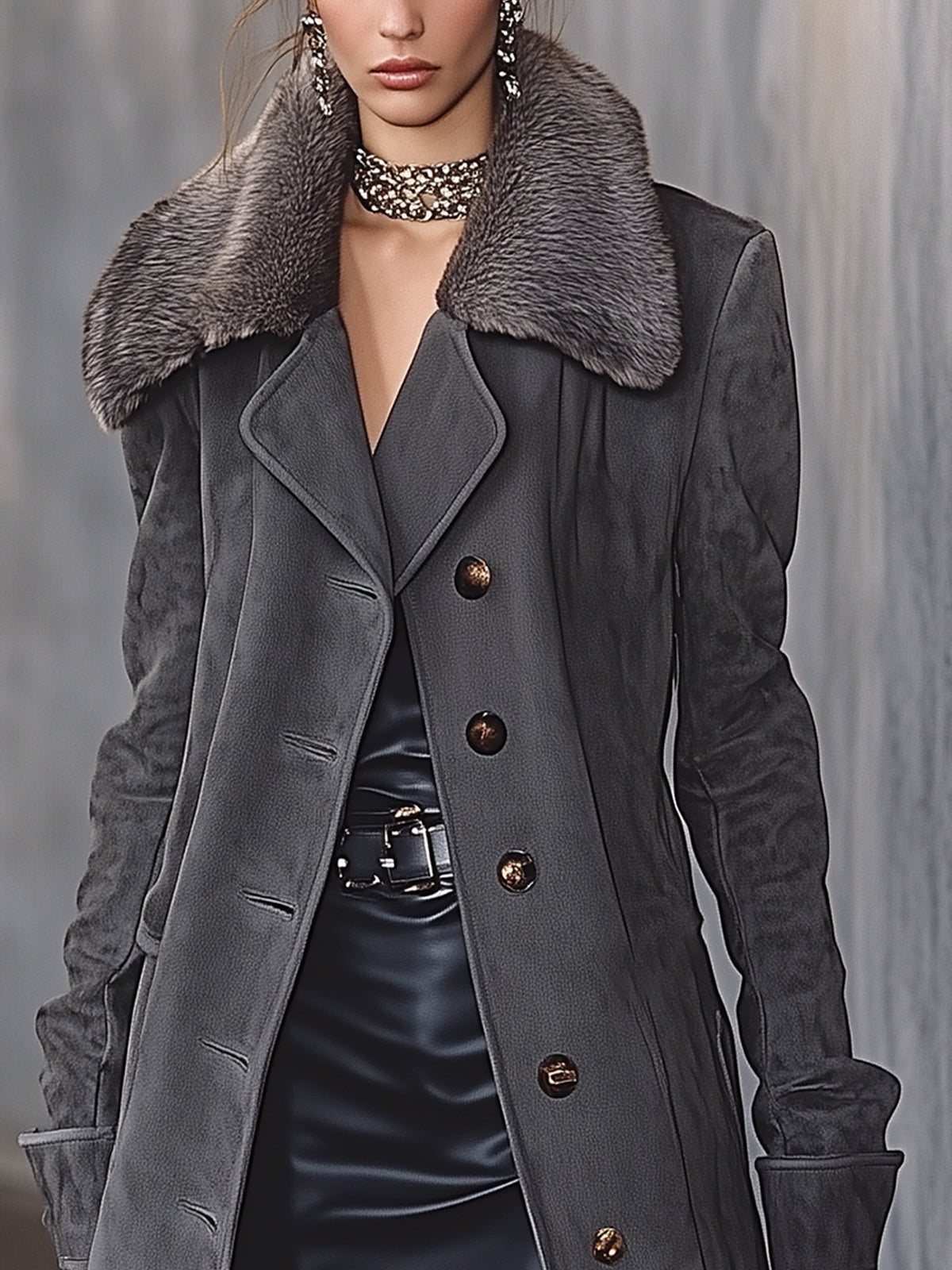 Gray Faux Suede Coat With Fur Collar And Button Detail