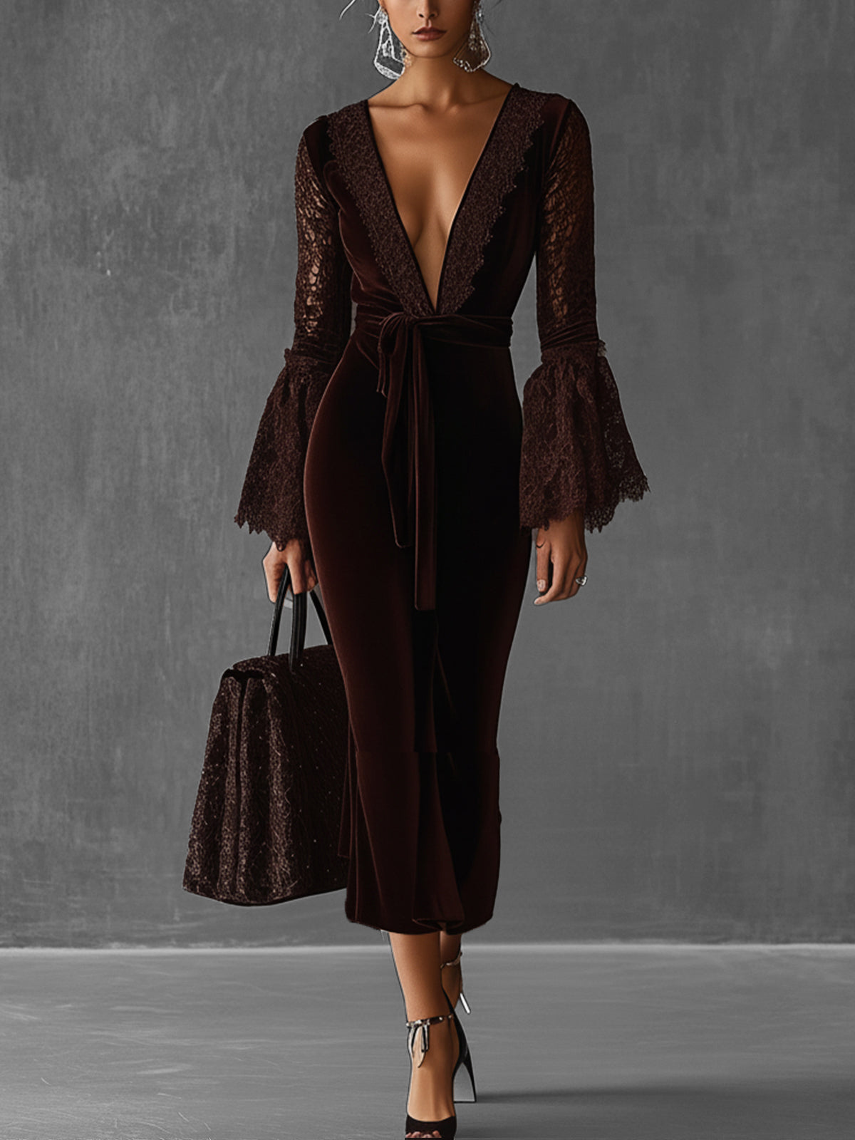 Deep Brown Velvet Plunge Neck Dress With Lace Bell Sleeves