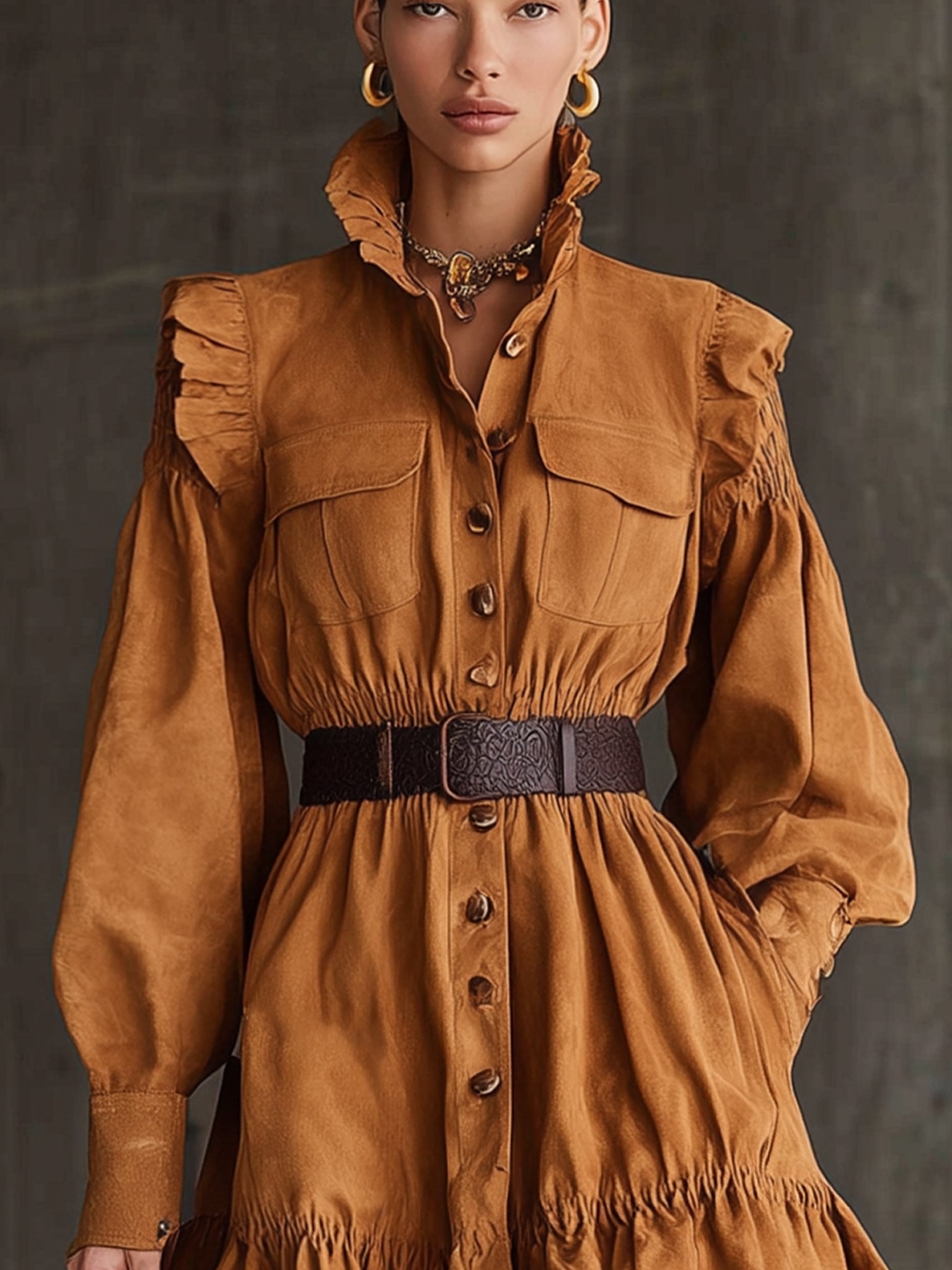 Brown Suede Ruffle Trimmed Belted Long Sleeve Mini Dress
