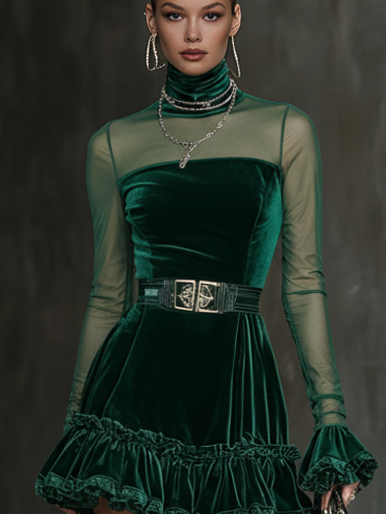 Emerald Sheer Sleeve Velvet Ruffle Mini Dress