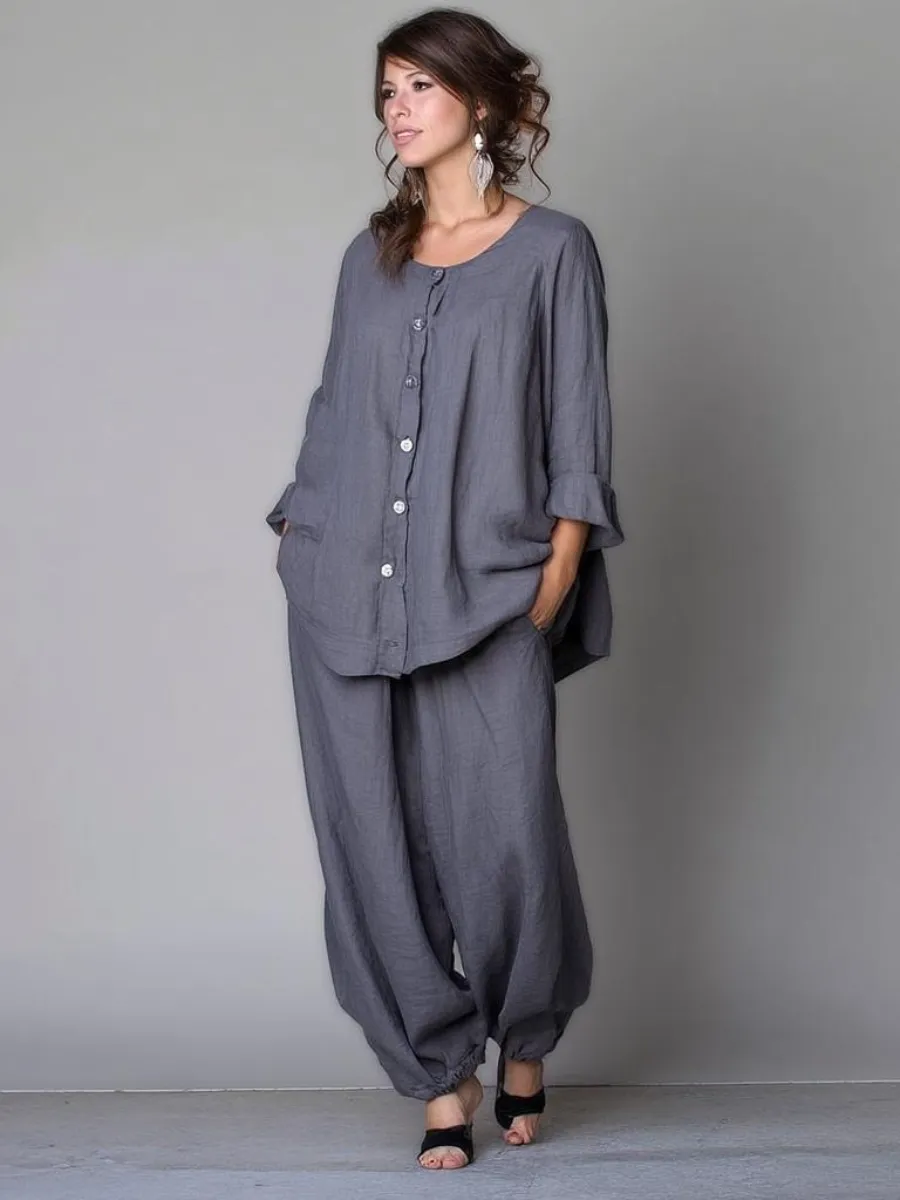 Women's cotton and linen round neck long sleeve suit