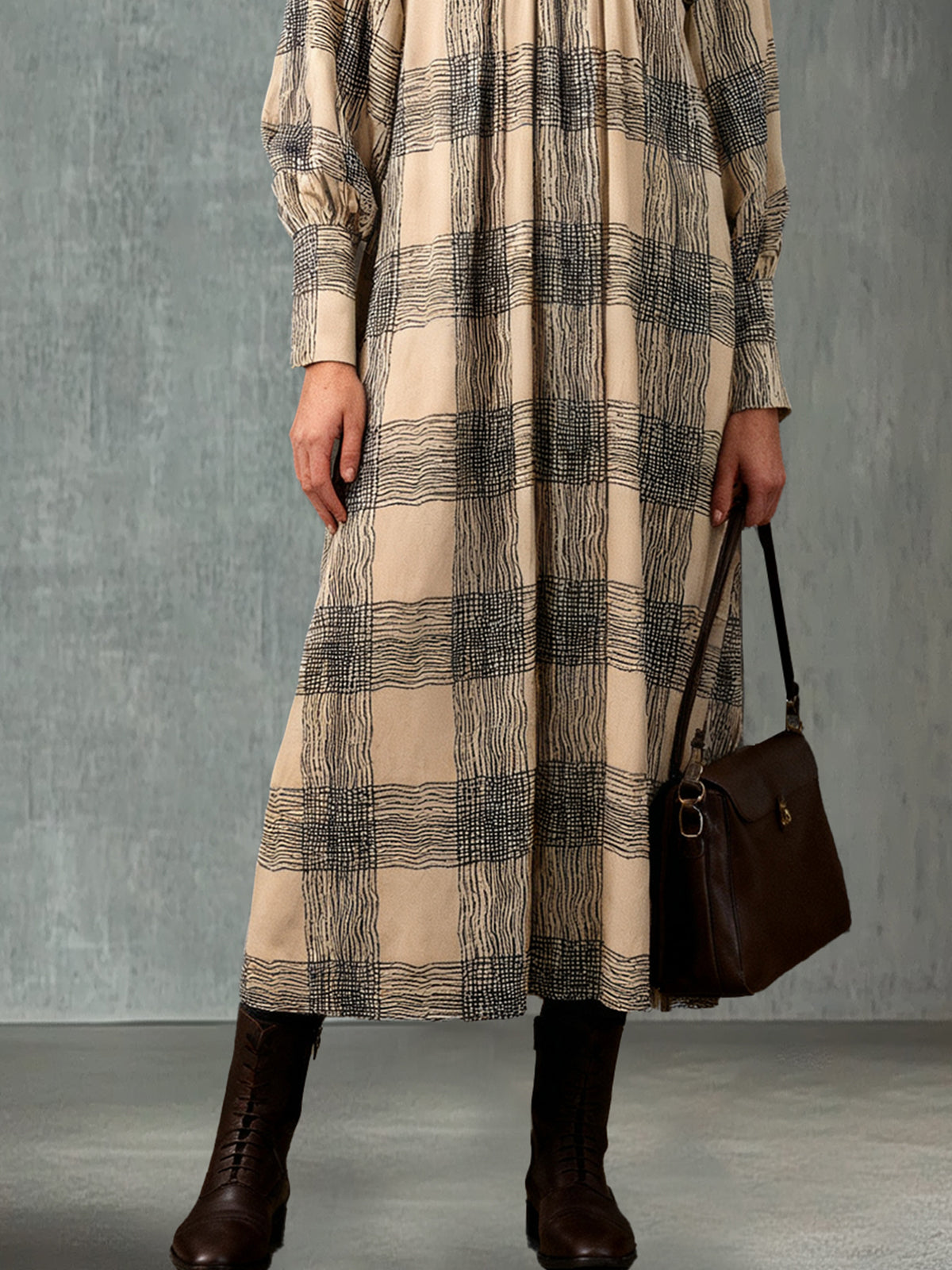 This beige plaid maxi dress is designed for both comfort and style, with its high neck and flowing fit adding timeless elegance. The neutral pattern makes it versatile for multiple occasions.