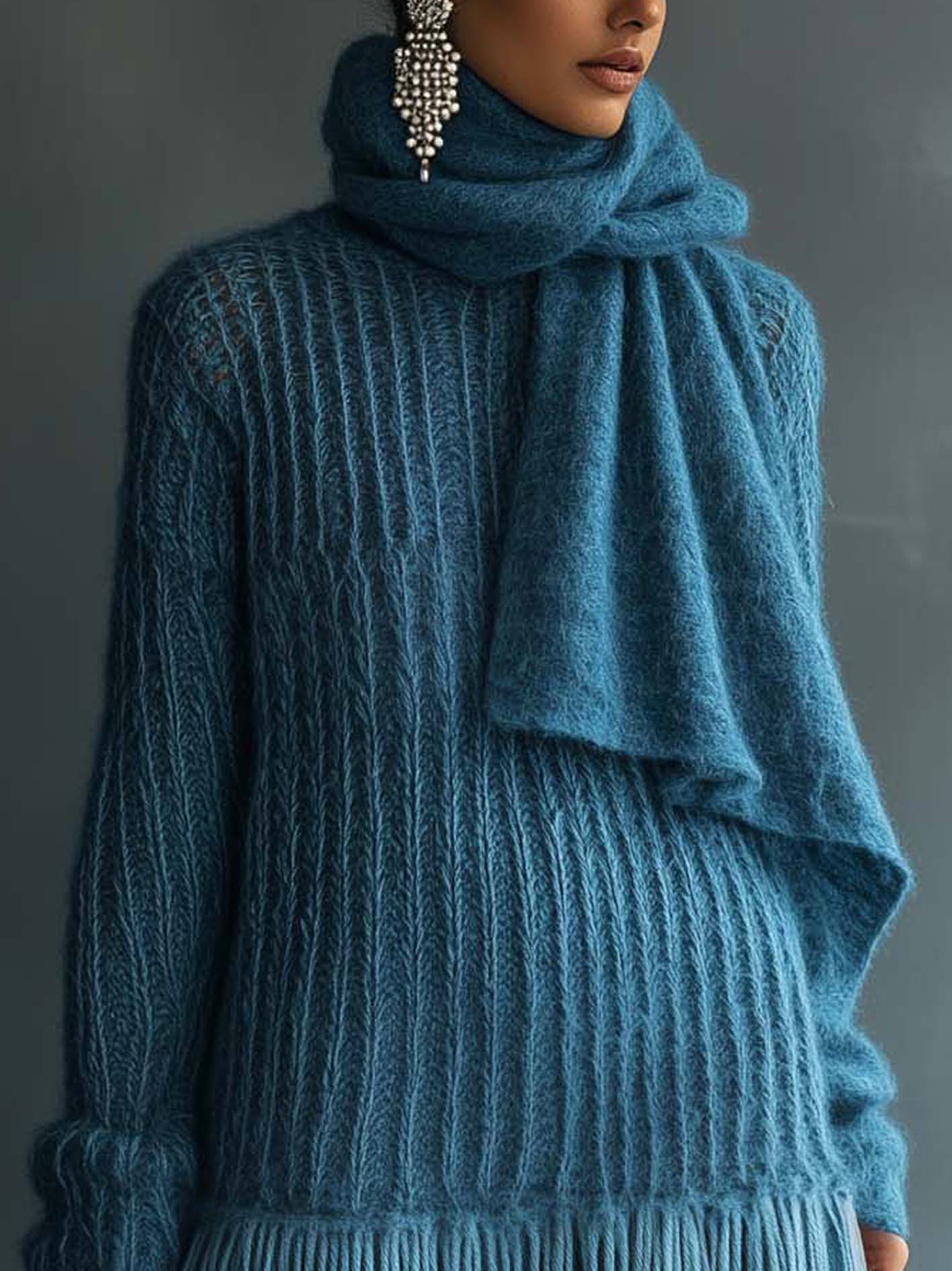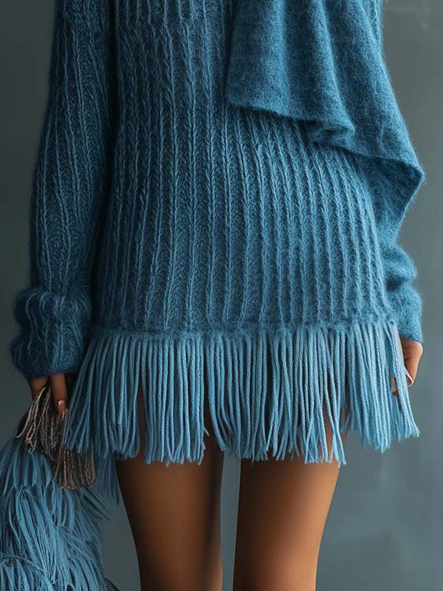 This blue knitted mini dress exudes bohemian charm with its tassel-trimmed hem and scarf integrated into the neckline. The scarf detail not only adds a design statement but also enhances warmth and comfort, making it both stylish and practical. The overall knitted texture lends a cozy sophistication, while the tassels bring movement and playful flair, balancing elegance with casual ease.