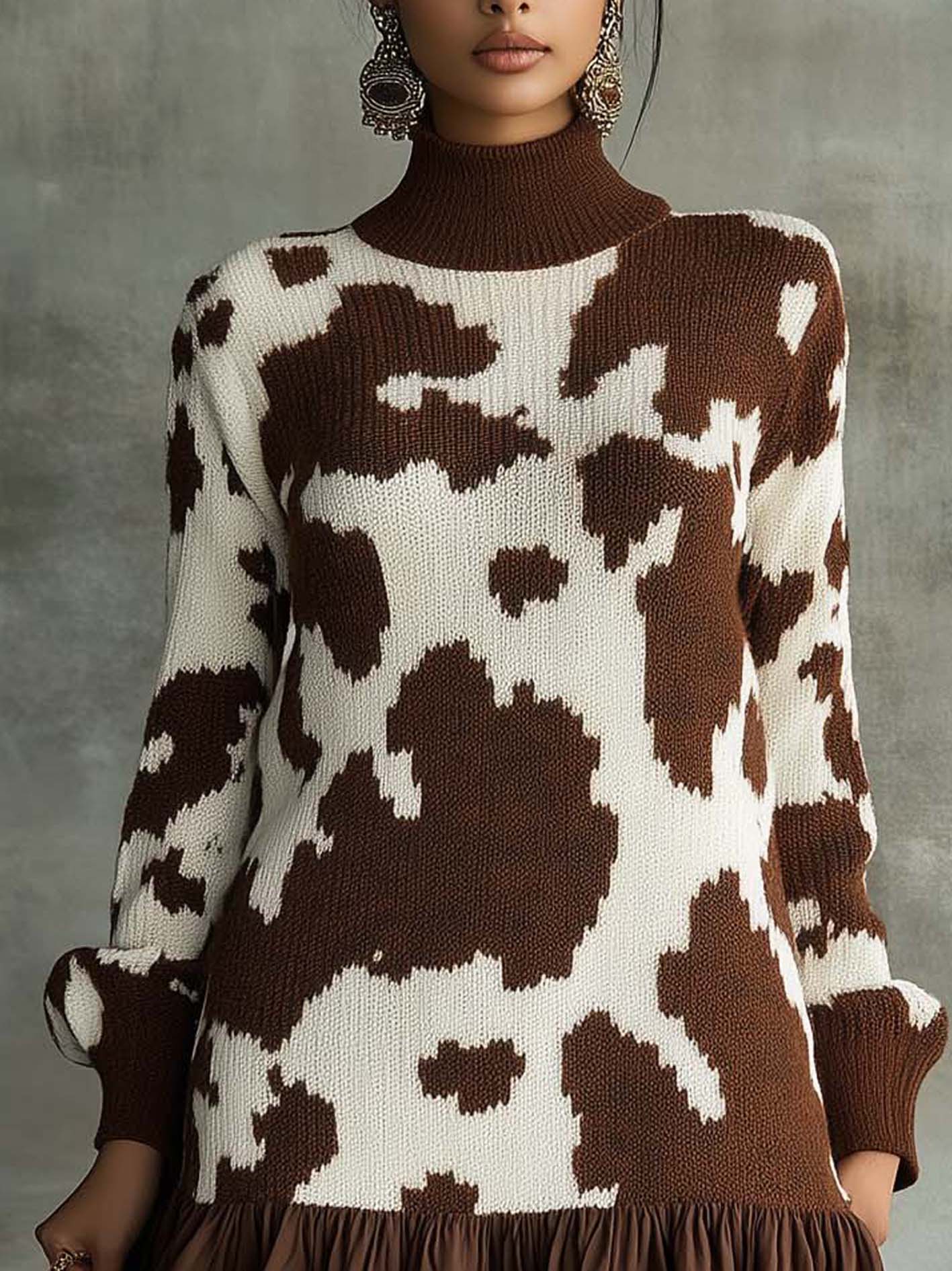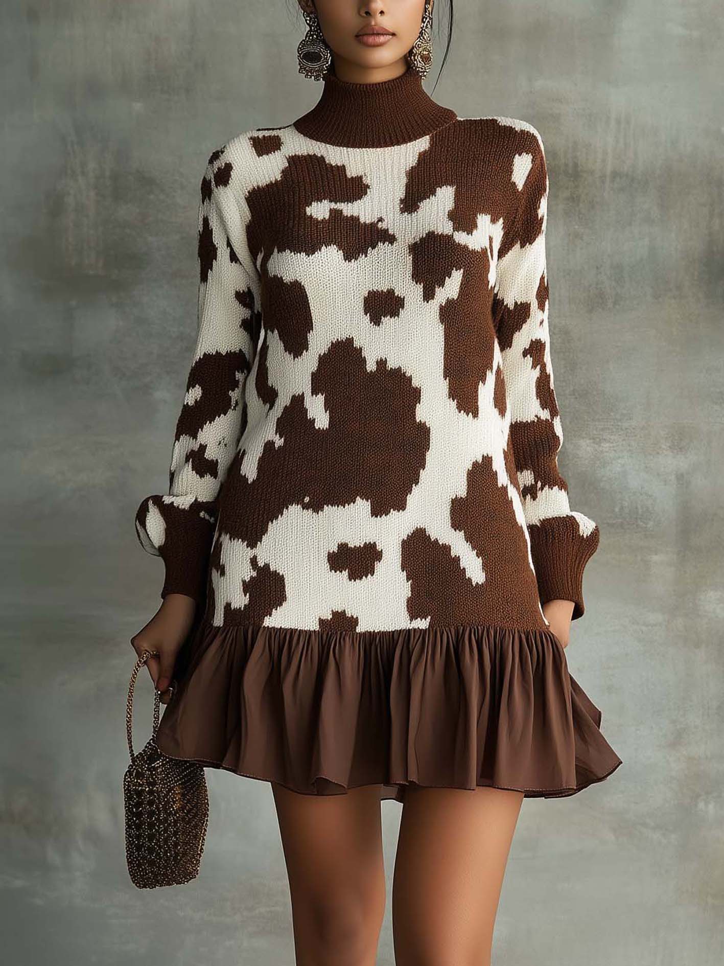 This brown cow-print knitted mini dress blends fun, playful style with a touch of chic femininity. The bold print makes it an eye-catching statement piece, while the soft ruffled hem adds balance and a subtle romantic flair. Its knitted construction ensures warmth and comfort, making it suitable for both style and seasonality.