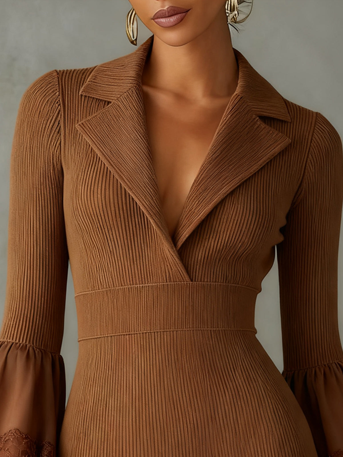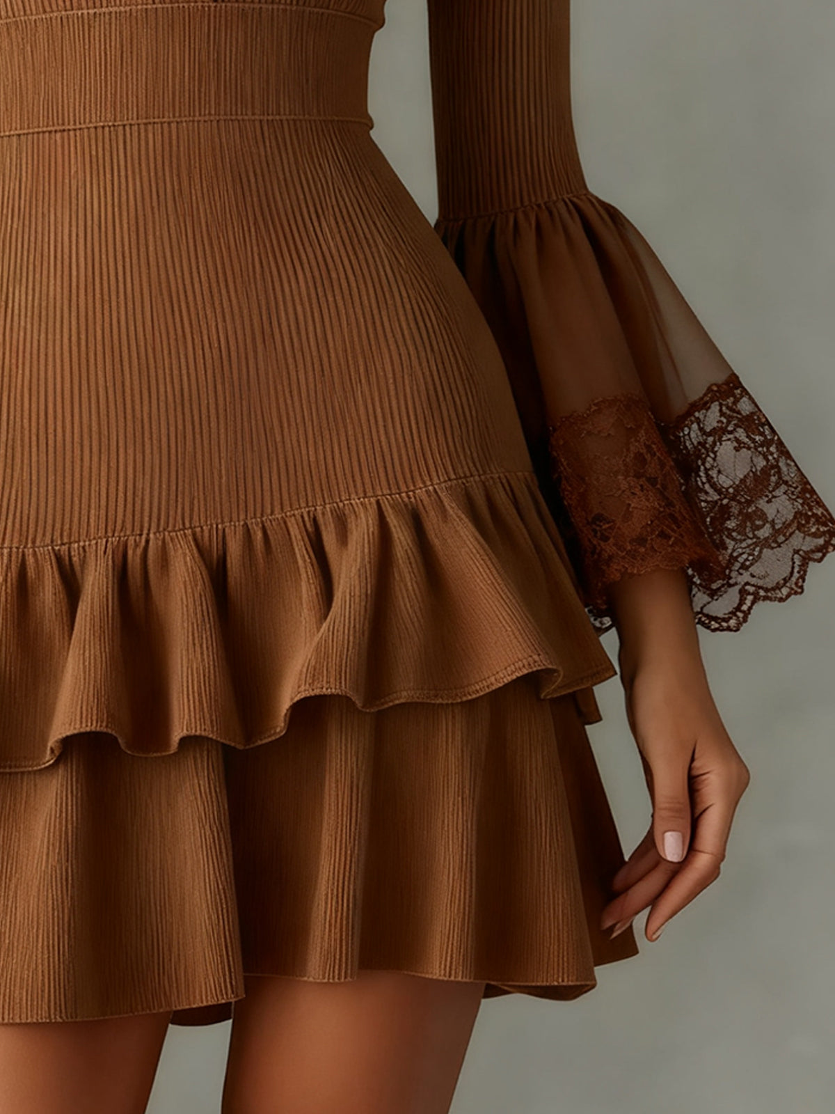 This brown dress seamlessly combines classic and contemporary elements, highlighted by its tailored collar and exquisite lace cuffs. The ribbed material adds a modern twist, while the ruffle skirt creates graceful movement. Perfect for elevating any occasion, style it with statement heels and a polished handbag for a vibrant look. Layer with a sleek blazer for professional settings, or add bold accessories to transition effortlessly from day to night.