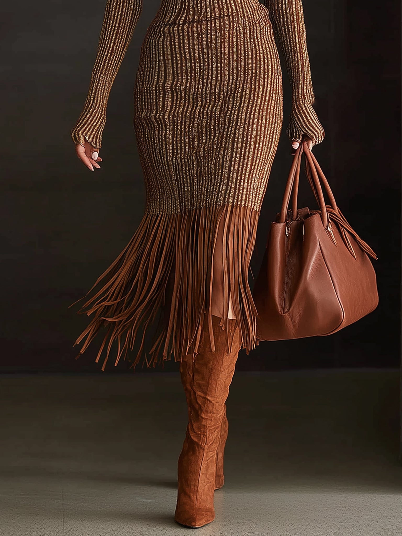 Design: This chic midi dress features a sleek turtleneck and long sleeves for a cozy yet sophisticated silhouette. The standout detail is the playful fringe hemline, which adds dynamic movement and a stylish Western-inspired twist.