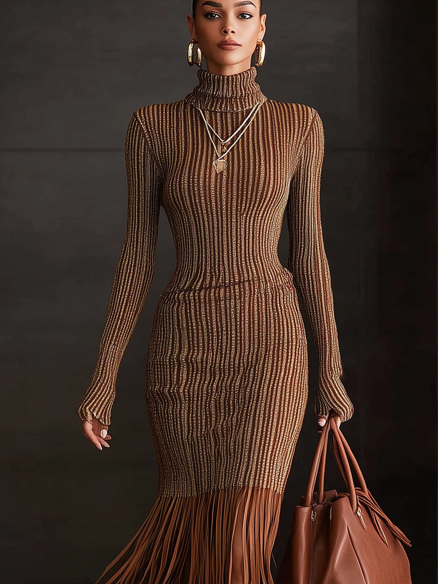 This ribbed turtleneck midi dress offers a fresh and fashionable take on cool-weather dressing. The cozy knit fabric hugs your silhouette while the delicate metallic accents add just enough sparkle to transition from day to night. Its modern turtleneck and long sleeves keep you warm, while the eye-catching fringe at the hem adds graceful movement and fun flair with every step.