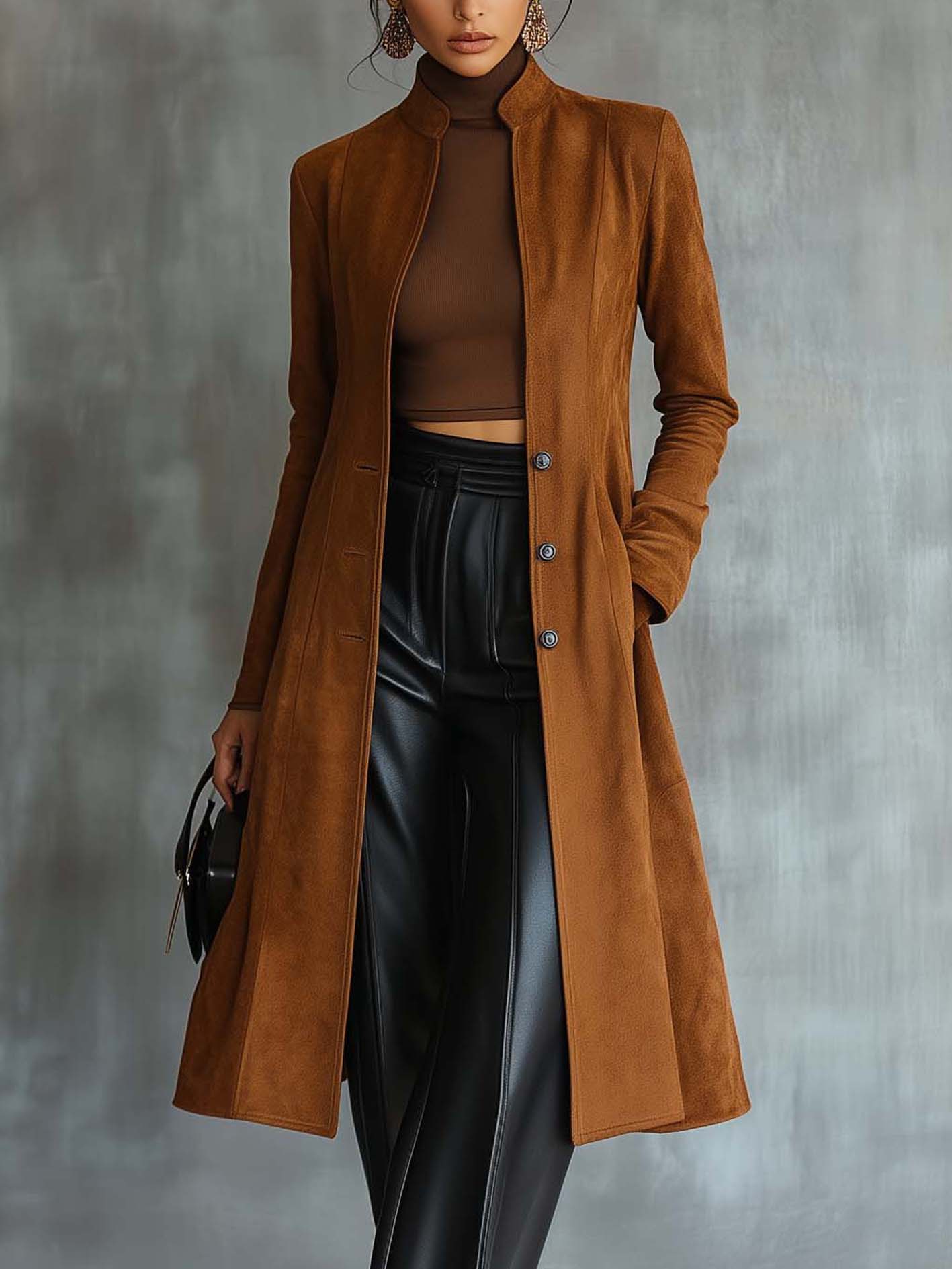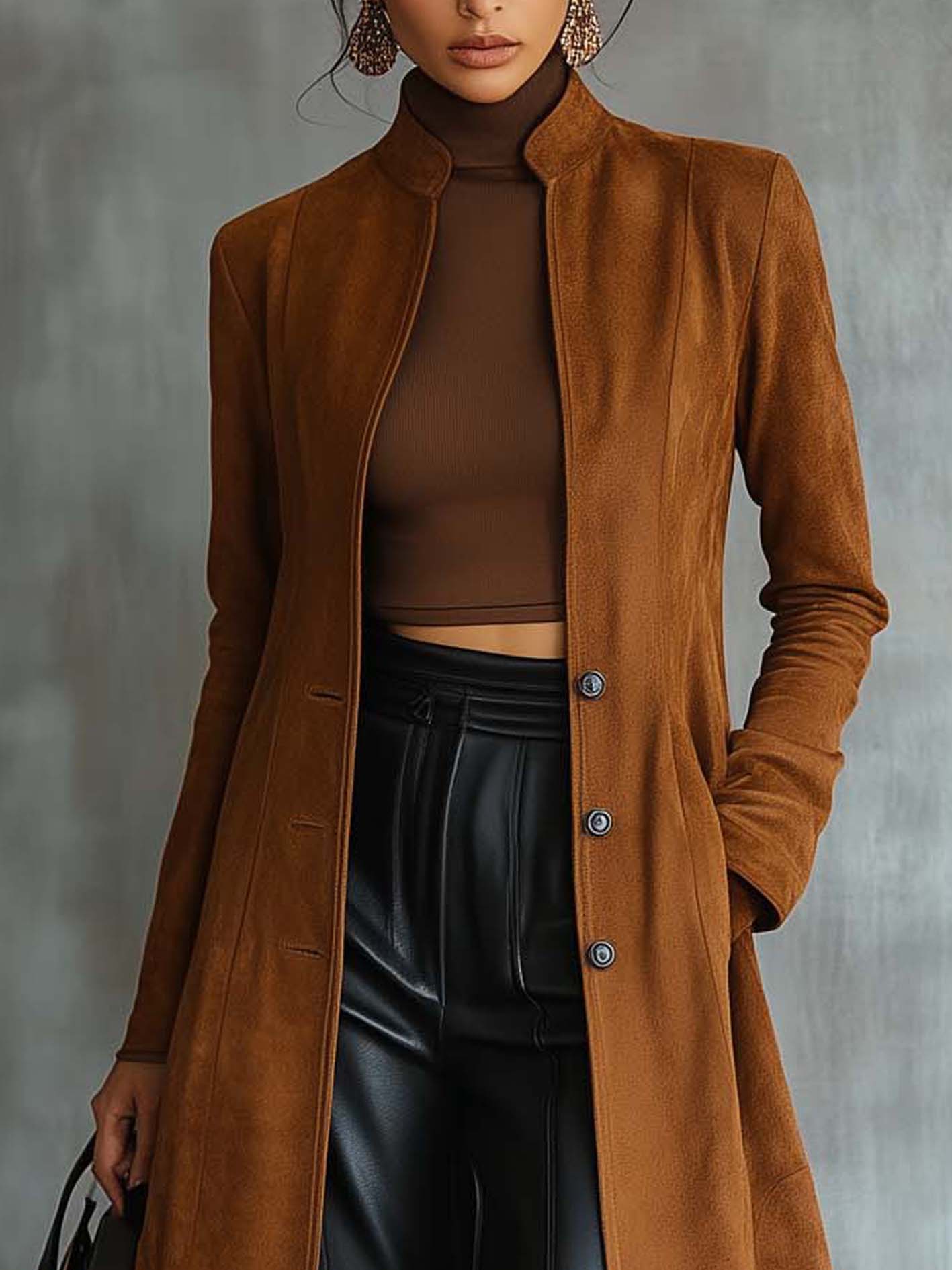 This brown suede coat stands out with its vintage charm and elegant tailoring. The stand-up collar adds a structured, sophisticated edge while the longline cut gives the piece a timeless, refined appeal. Its suede texture enhances the overall richness, making it both classic and versatile. This coat effortlessly bridges vintage inspiration with contemporary styling, turning it into a seasonal wardrobe statement.