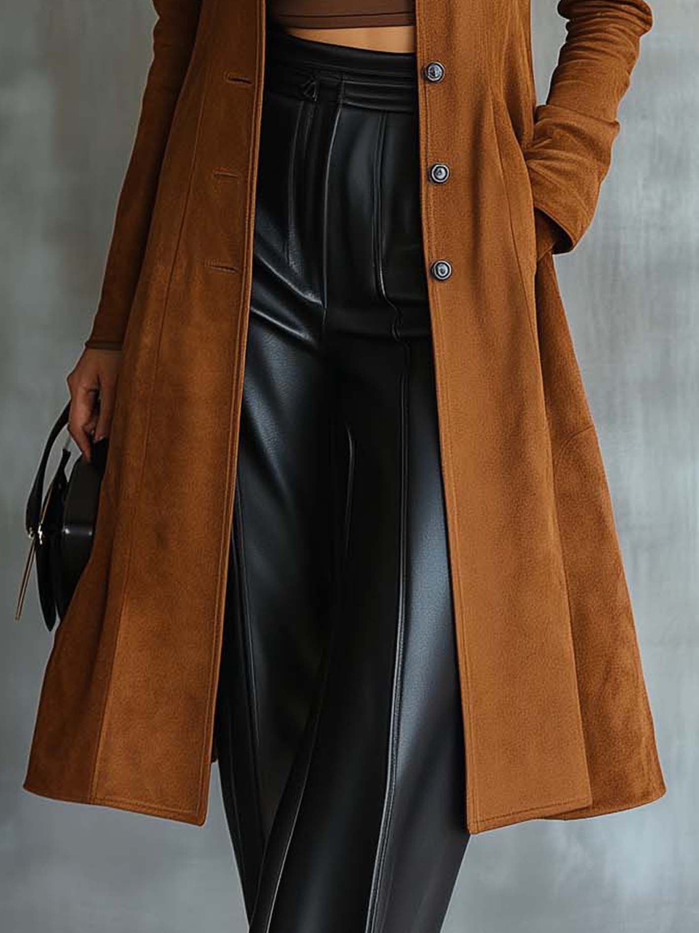 Pair this suede coat with black leather trousers or high-waisted jeans for a sleek, modern vibe. For a more elegant styling, wear it over a fitted midi dress or a monochrome ensemble in beige or cream tones. Complete the look with ankle boots or pointed heels, and accessorize with minimal gold jewelry to emphasize its sophisticated, retro charm.
