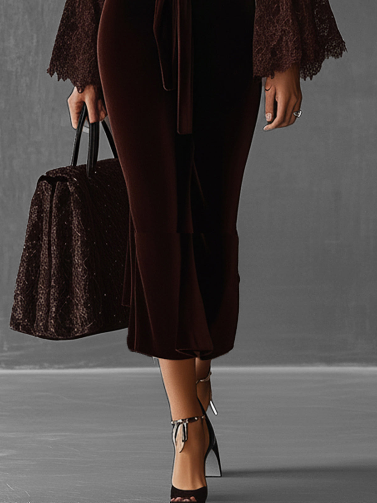 This deep brown velvet dress captivates with its luxurious feel and bold design elements. The plunge neckline adds allure, while the lace bell sleeves introduce a touch of romance and elegance.