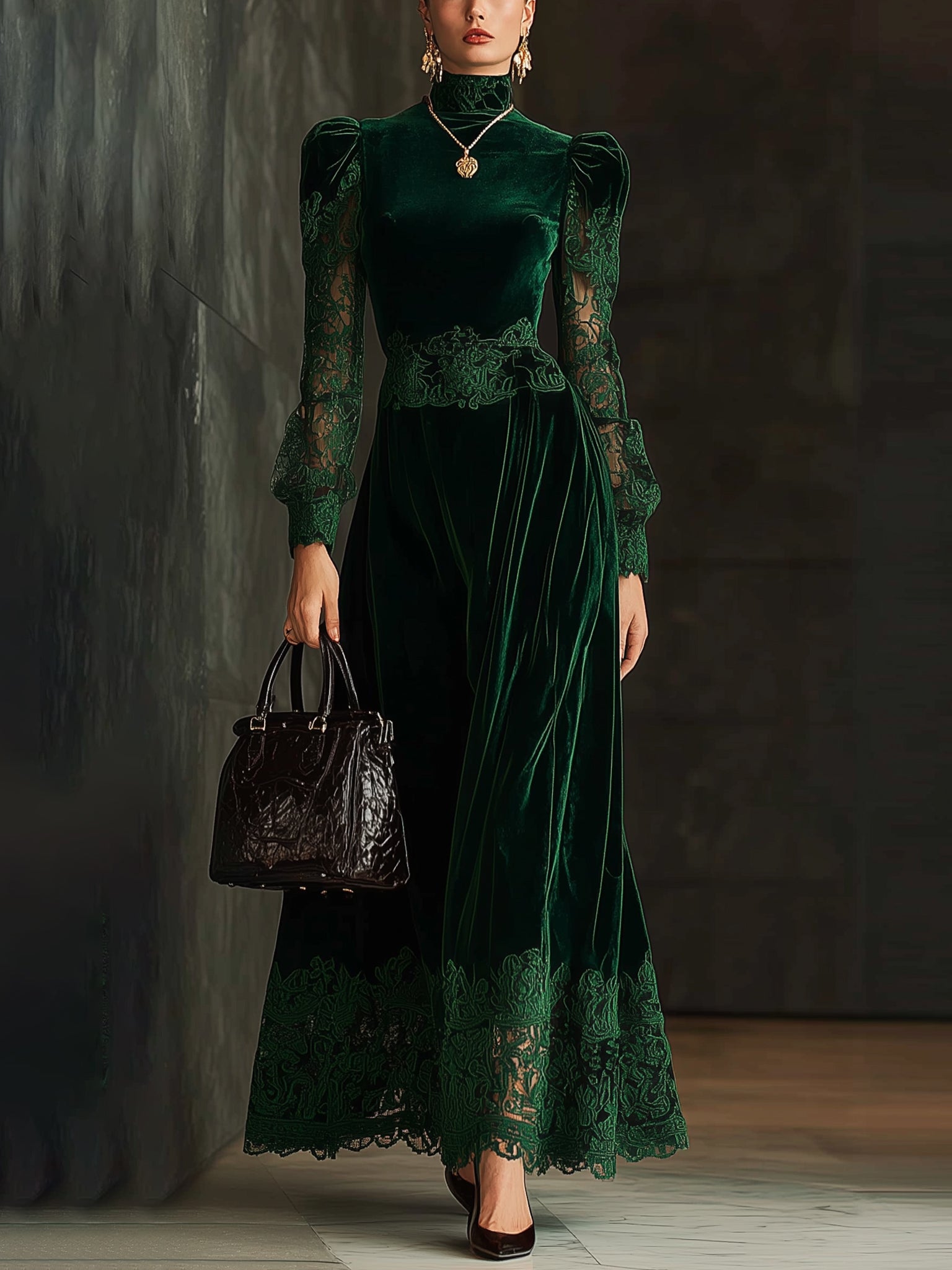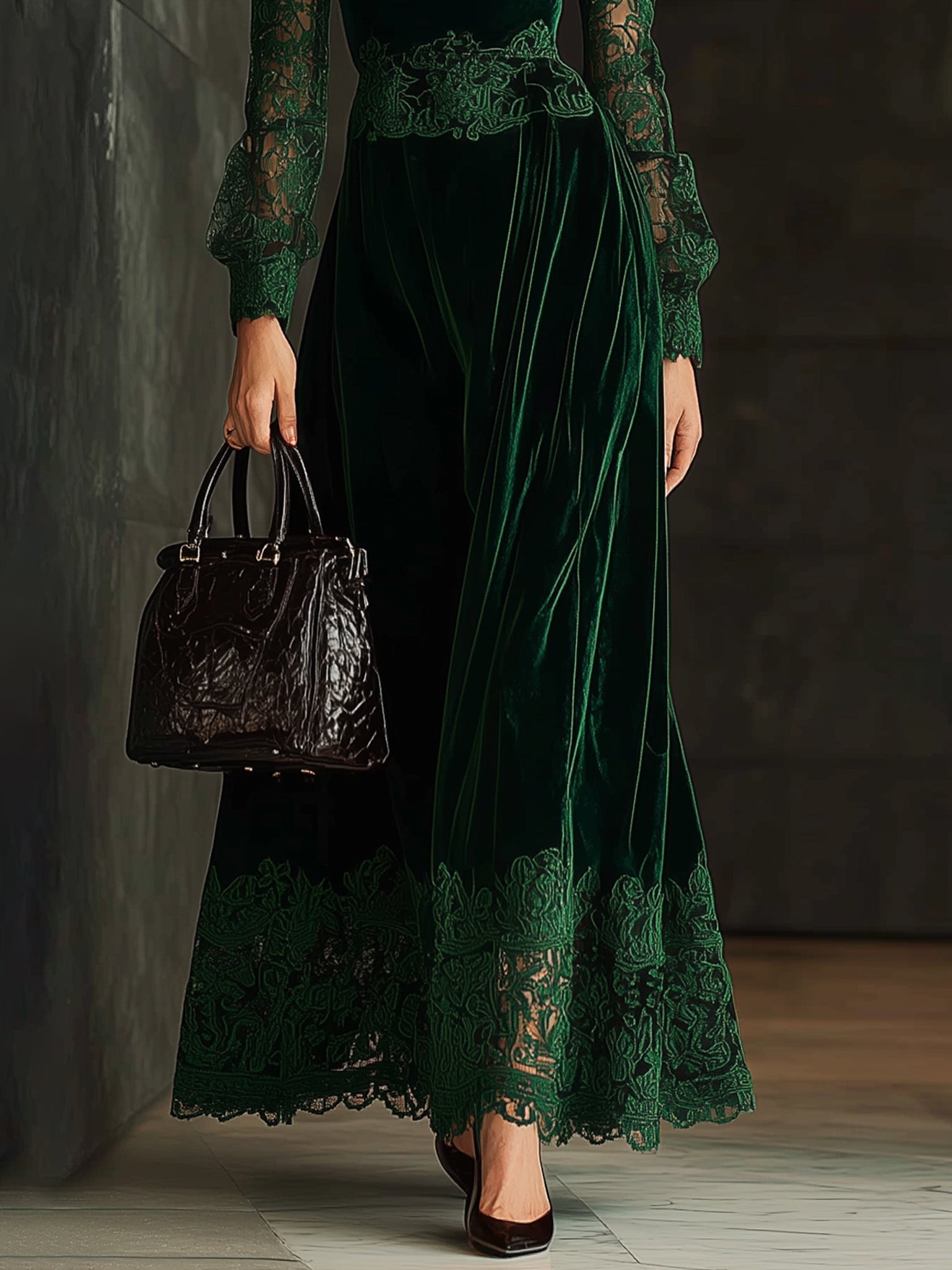Material: Made from rich emerald green velvet paired with exquisite sheer lace, this dress features a sumptuous texture that reflects light and adds a luxurious sheen. The combination of velvet and lace offers both warmth and elegance, making it ideal for formal settings.