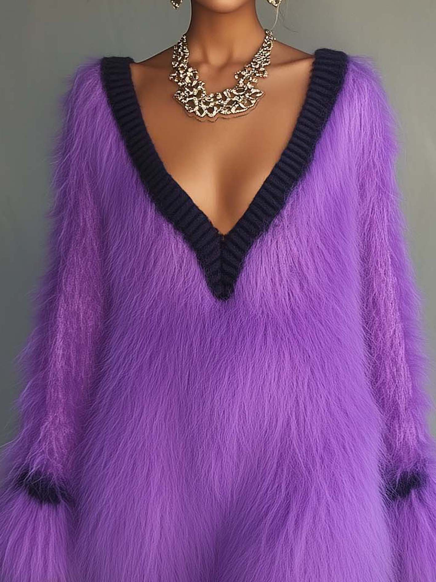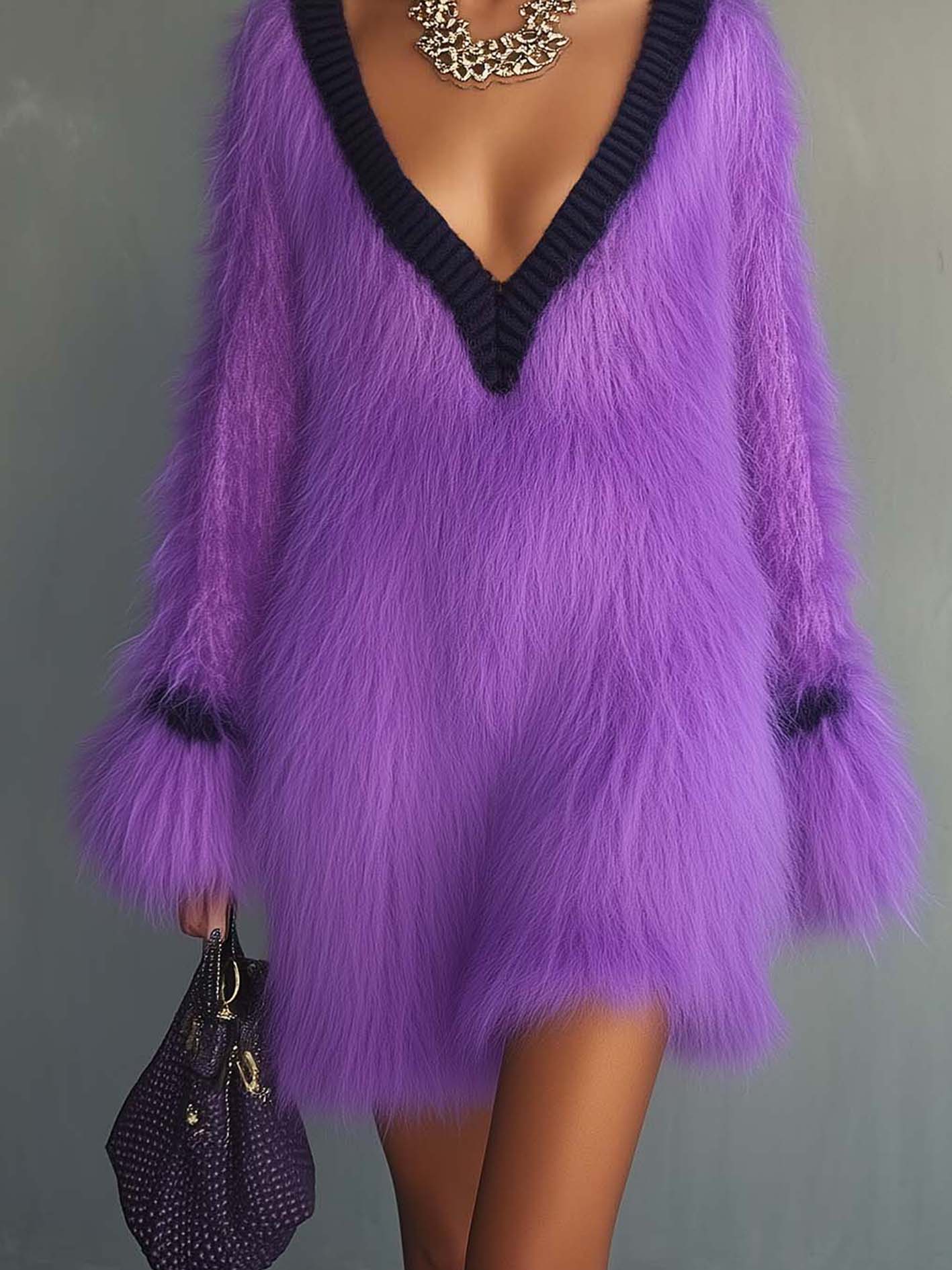 This fuzzy purple knit mini dress makes a dramatic fashion statement with its bold color and textured finish. The deep V-neck outlined in black trim adds sleek definition against the voluminous silhouette, while the fuzzy knit creates a playful yet glamorous aesthetic. It’s a daring piece that commands attention and blends cozy fabric with evening-ready appeal.