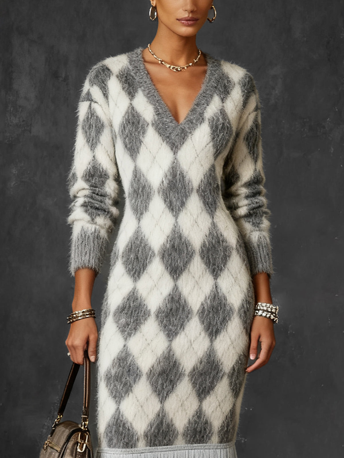 This argyle knit dress combines timeless style with contemporary flair. The unique fringe hem adds movement and a touch of playful sophistication, while the soft knit ensures comfort.