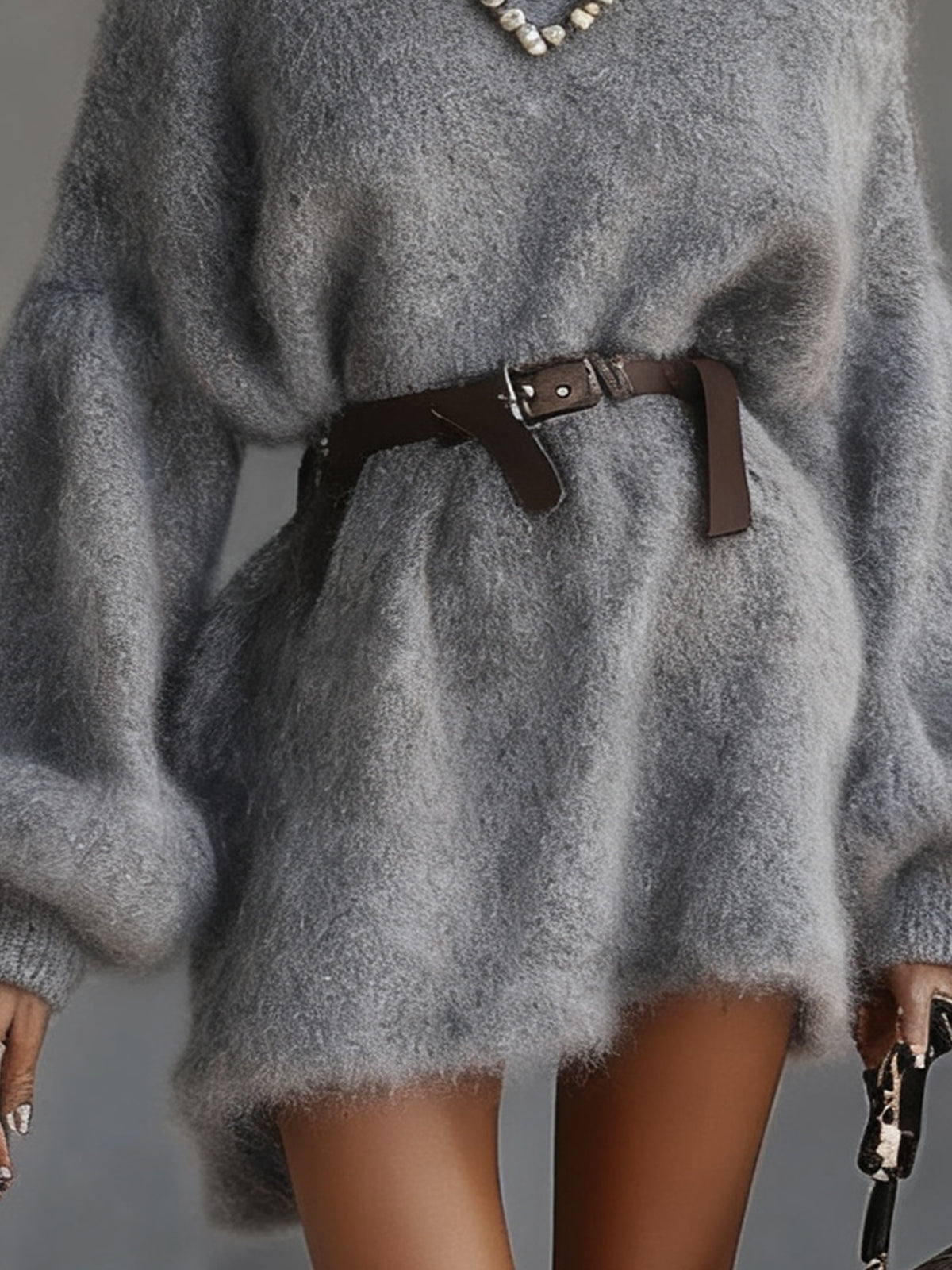 Embrace ultimate comfort and style with this grey fuzzy knit dress. Its oversized design and cozy material make it ideal for cooler weather, while the cinched waist and balloon sleeves add a modern flair. The neutral shade allows for versatile styling.