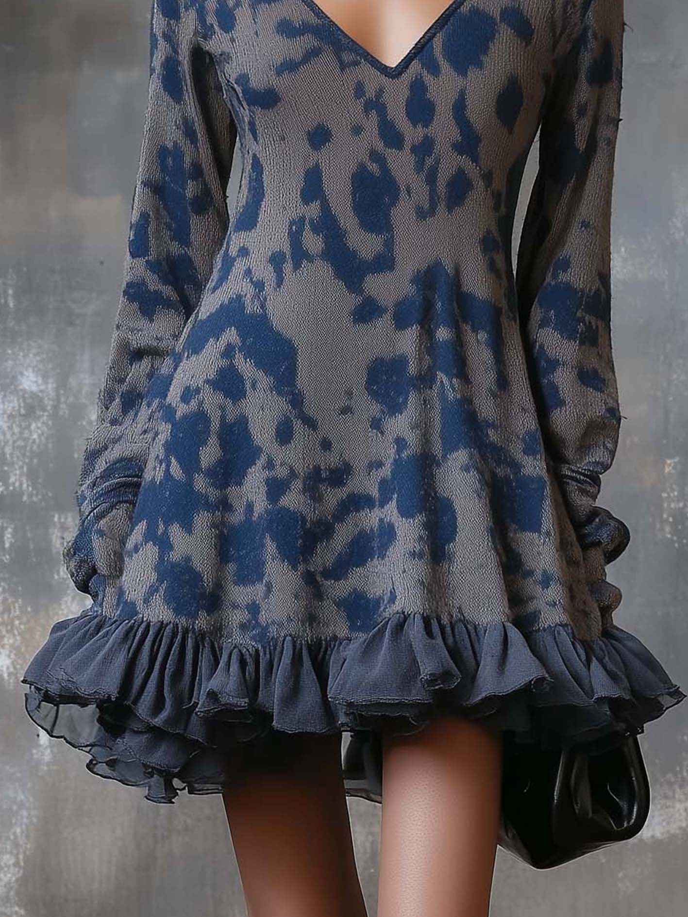 This mini dress blends casual comfort with chic details. The knit base ensures softness and warmth, while the bold dark blue camouflage print adds edge and modernity. The chiffon ruffles at the hem soften the look, creating a feminine contrast against the structured knit. The V-neckline elongates the neckline and balances the long sleeves, making it versatile and flattering.