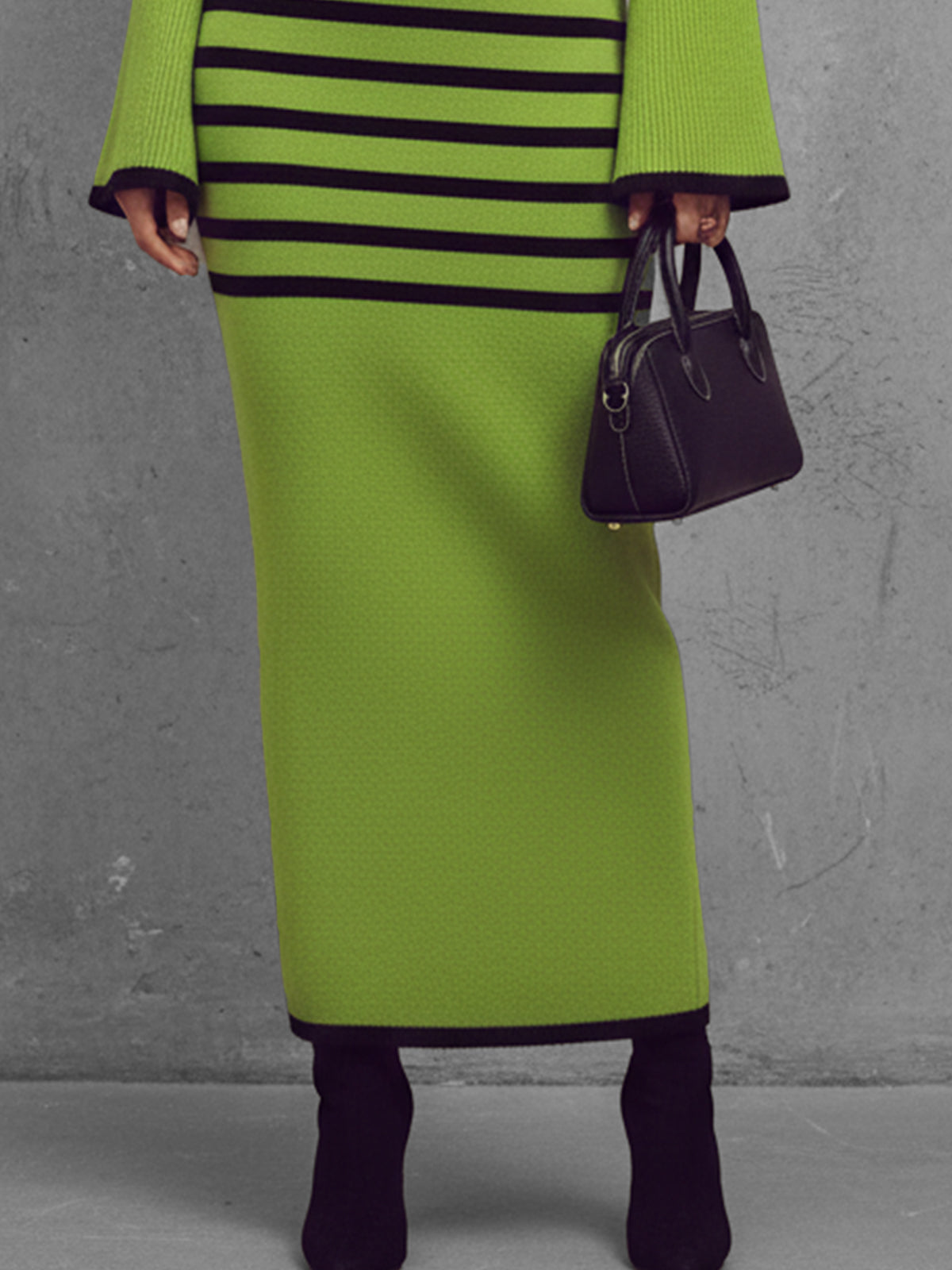 This striking maxi dress combines vibrant stripes with a classic turtleneck and standout bell sleeves. The dramatic length and form-fitting design create a sleek, contemporary silhouette.