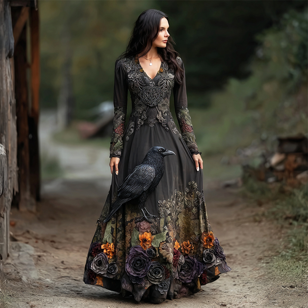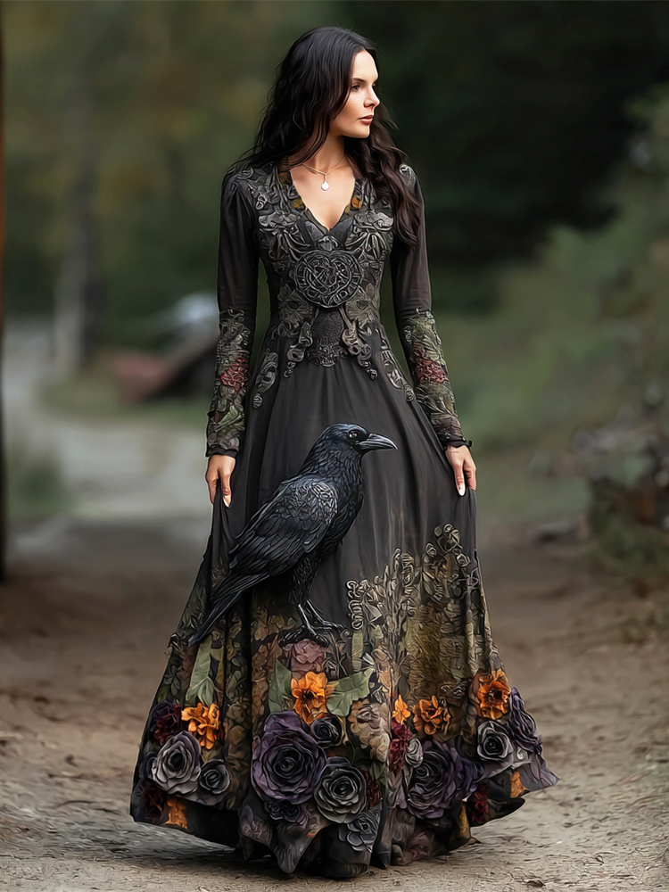 Halloween Crow & Rose Dark Witch Art Women's V-neck Long-sleeve Maxi Dress