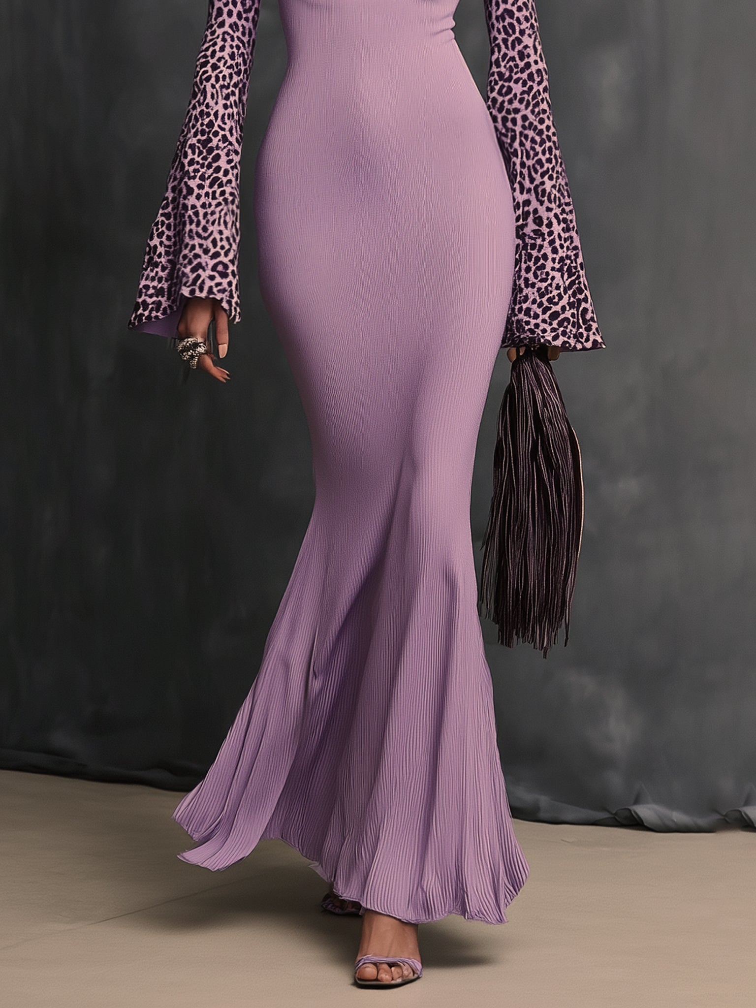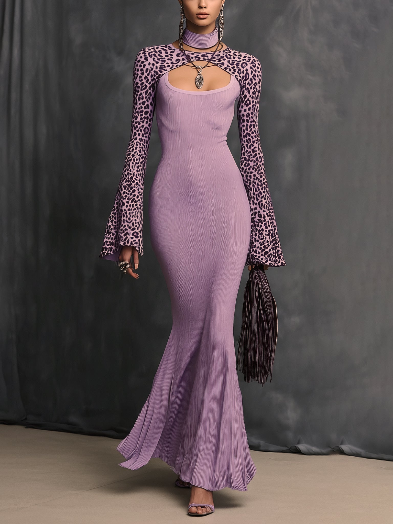 Design: This standout maxi dress features a daring chest cutout framed by bold leopard-print sleeves, creating a double-layered look. The flared cuffs and high neckline add drama and dimension, while the dress gradually flows into a pleated, fishtail-inspired hem.