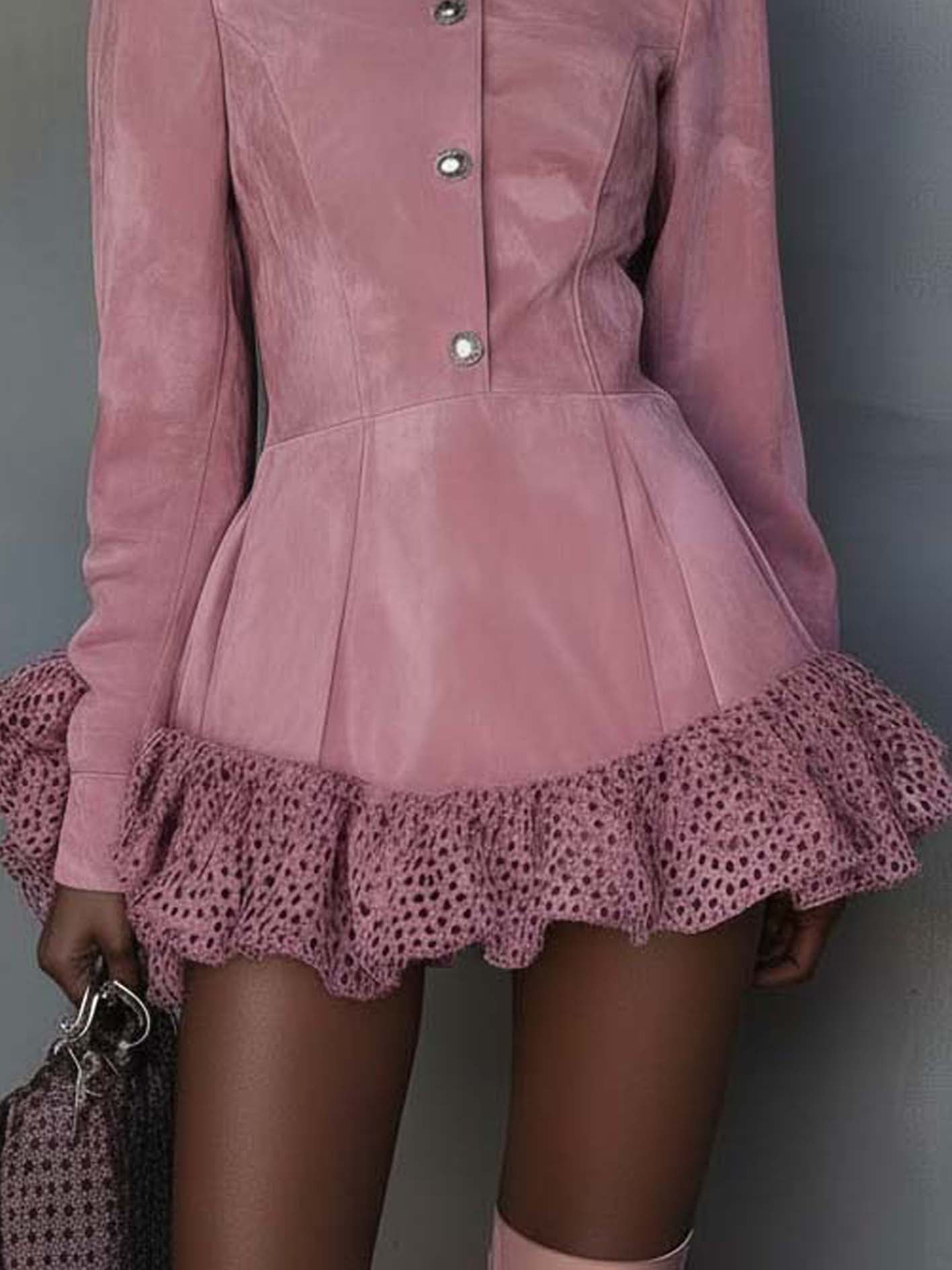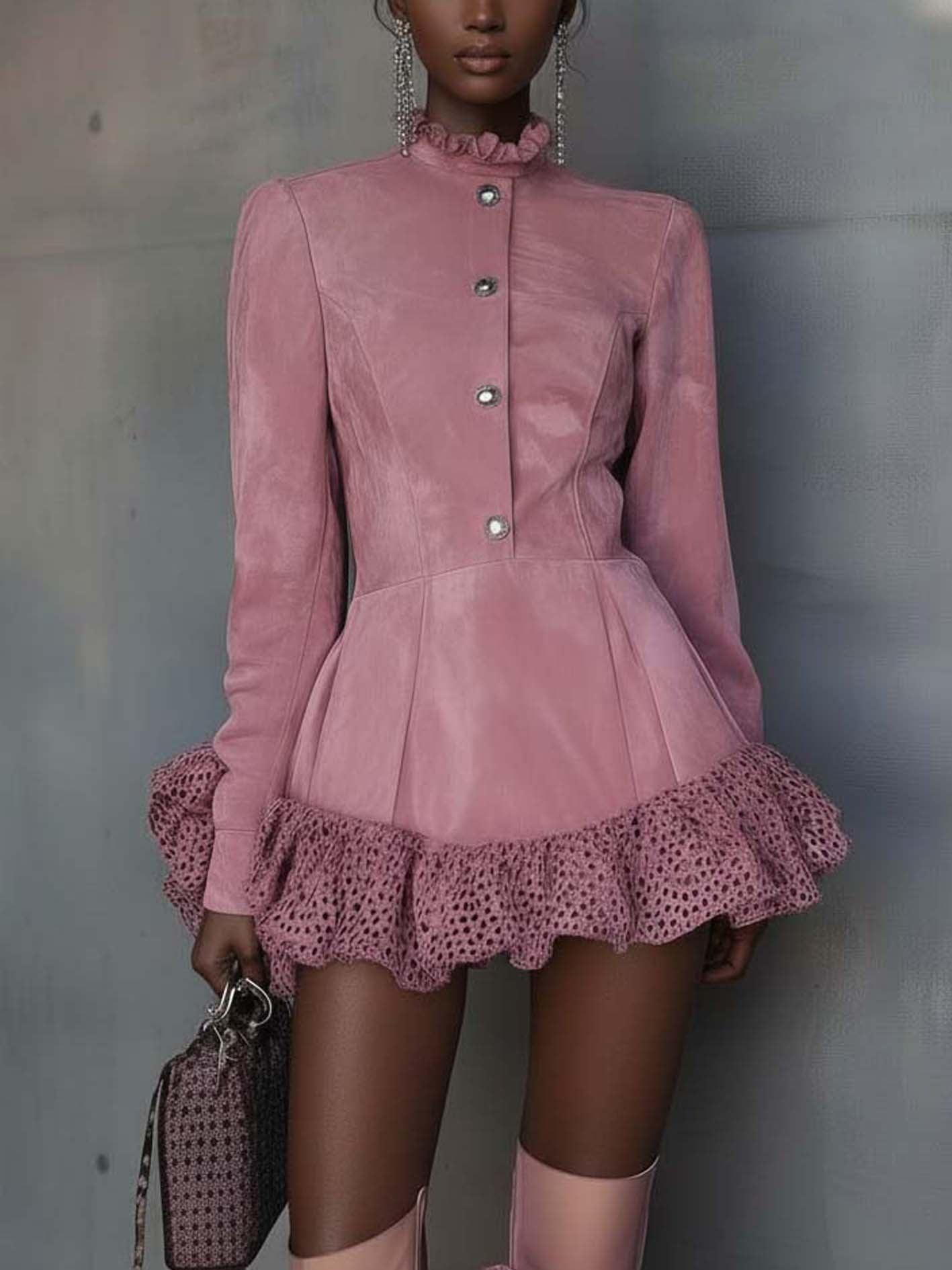 This pink faux suede mini dress skillfully combines romantic femininity with bold detailing. The structured top with gemstone-style buttons brings sophistication, while the leopard print ruffles inject a touch of playful energy and modern edge. The high neckline and fitted waist enhance an elegant silhouette, while the textured ruffles make the piece striking and eye-catching.