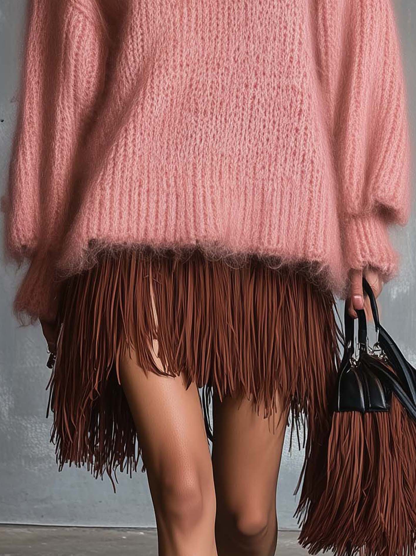 This piece merges cozy knitwear with playful fringe elements, striking a balance between comfort and bold style. The oversized pink sweater adds softness and warmth, while the brown tassel mini skirt injects movement and edge, making the design both chic and fun. The combination of textures—soft knit and structured fringe—creates visual depth and a runway-inspired aesthetic.