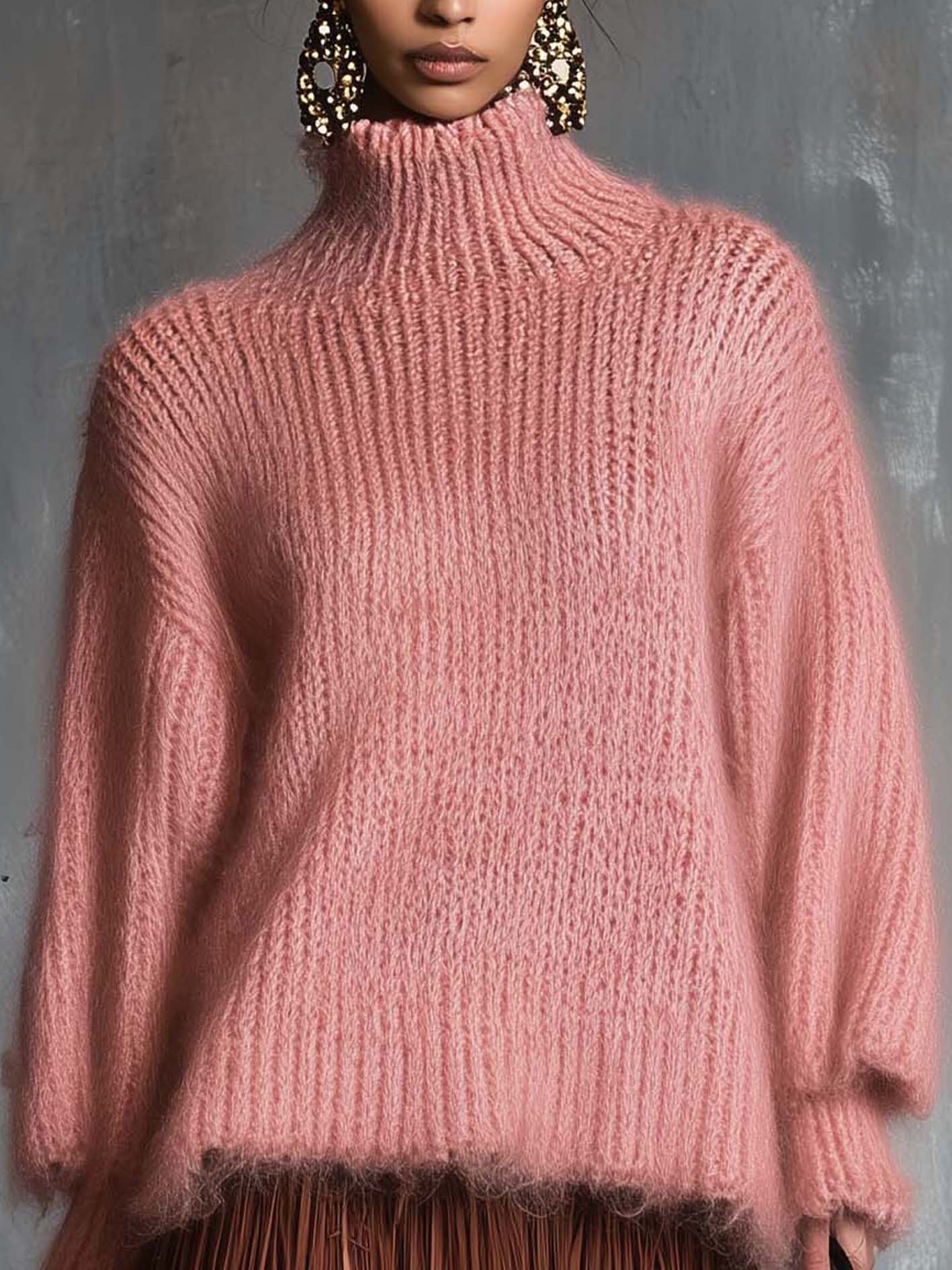 Pair with knee-high boots or heeled ankle boots to elongate the legs. Add statement earrings (as styled) for a glamorous touch, or layer with a long tailored coat for a chic urban look. A small structured bag would balance the volume of the knit.