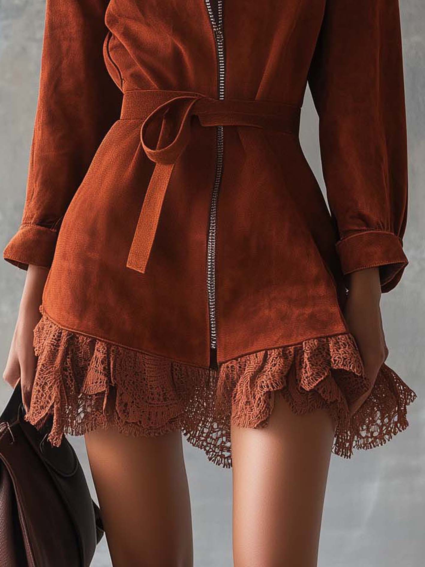 This reddish-brown faux suede mini dress strikes a balance between edgy and elegant. The bold zipper brings a modern, functional twist, while the lace hem softens the look with a romantic and feminine touch. The belted waist adds definition, highlighting the silhouette, and the faux suede texture offers warmth and richness, making it a versatile seasonal piece.