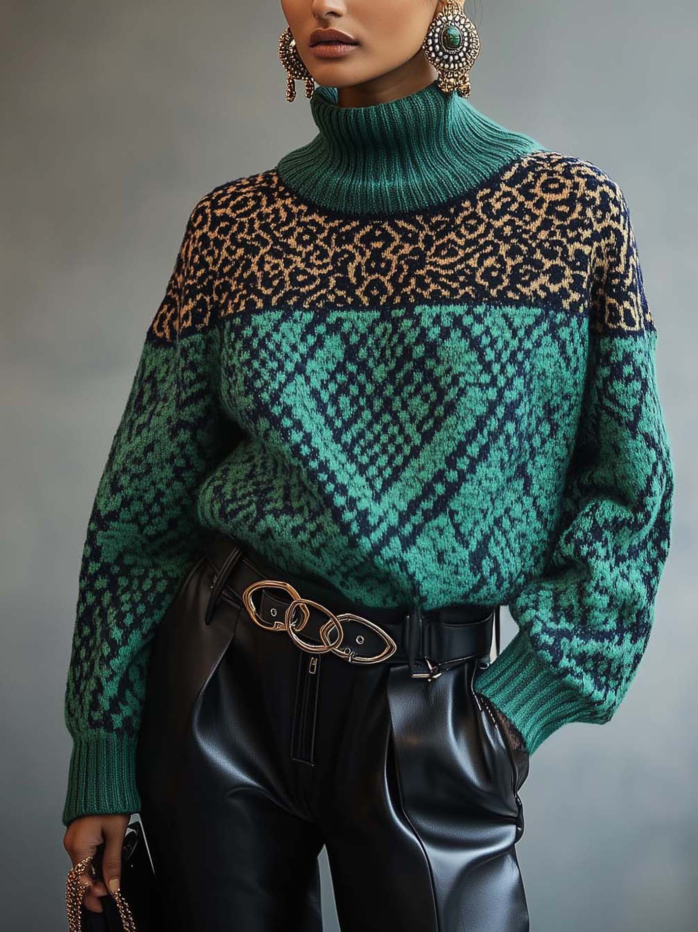 This cyan turtleneck sweater brings together retro charm and modern comfort. The bold patterned knit adds texture and vibrancy, while the high turtleneck provides added warmth and a chic silhouette. Its slightly oversized fit makes it versatile, ensuring ease of layering and a relaxed yet stylish presence. The retro pattern really stands out, making the sweater not just cozy but also fashionable.