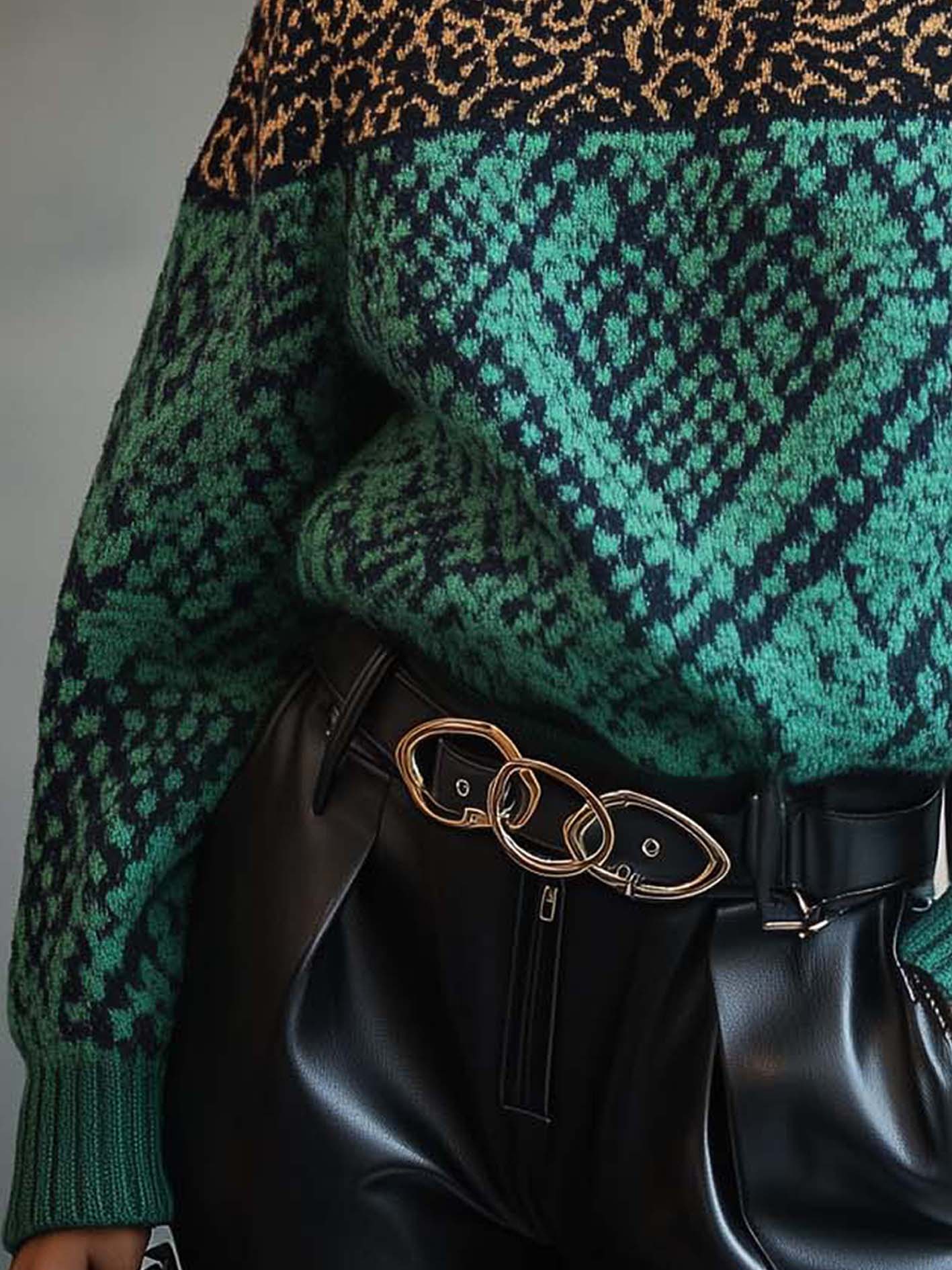 Pair this sweater with high-waisted leather trousers or slim-fit jeans for a sleek, modern twist on the retro look. For a softer outfit, it works beautifully with wool skirts or wide-leg trousers. Keep accessories minimal, such as gold or silver earrings and a structured handbag, allowing the sweater’s vibrant pattern to be the focal point. Boots or loafers complete the outfit effortlessly, enhancing both warmth and style.
