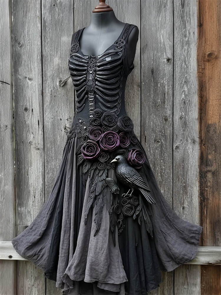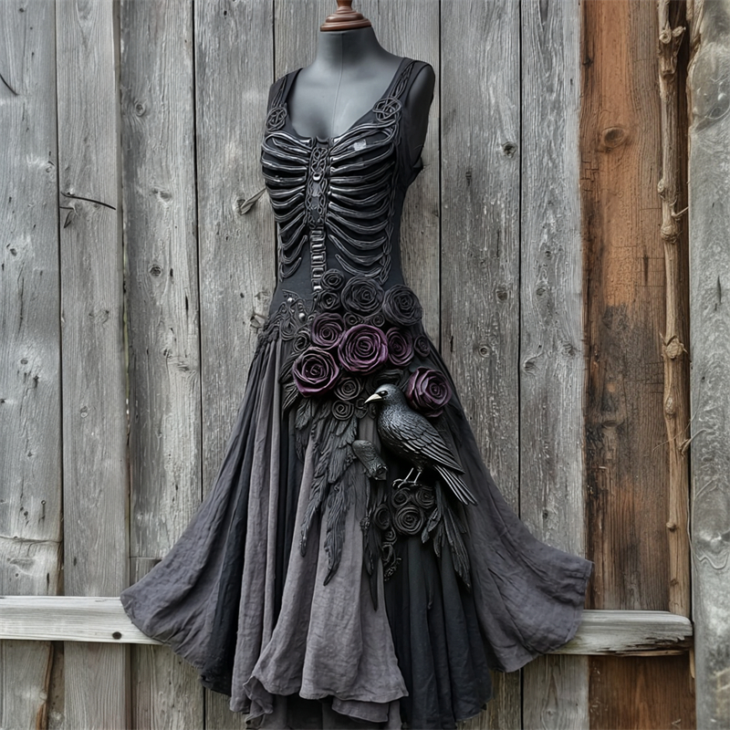 Vintage Rib Cage Raven & Roses Flowy Linen Dress