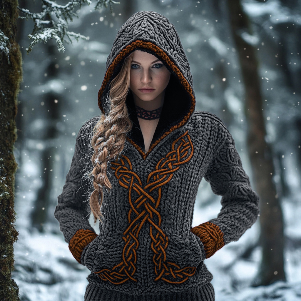 Women's Viking Celtic Knot Jacquard Knit Hooded Sweater