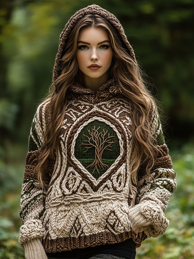 Women's Viking Style Tree Of Life Cozy Chunky Hooded Sweater