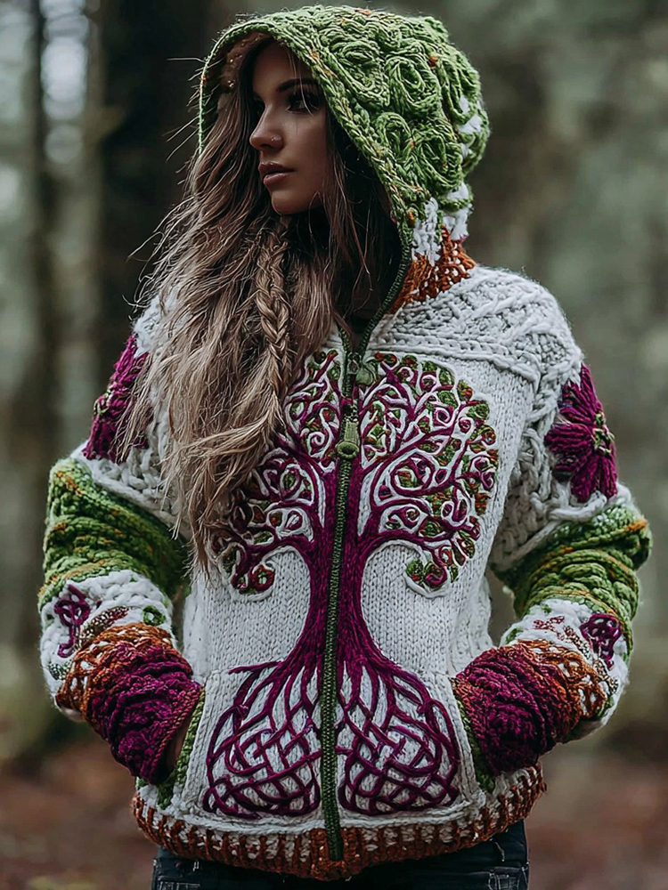 Women's Vintage Viking Celtic Knot Tree Of Life Art Knitted Warm Zip Hooded Sweater